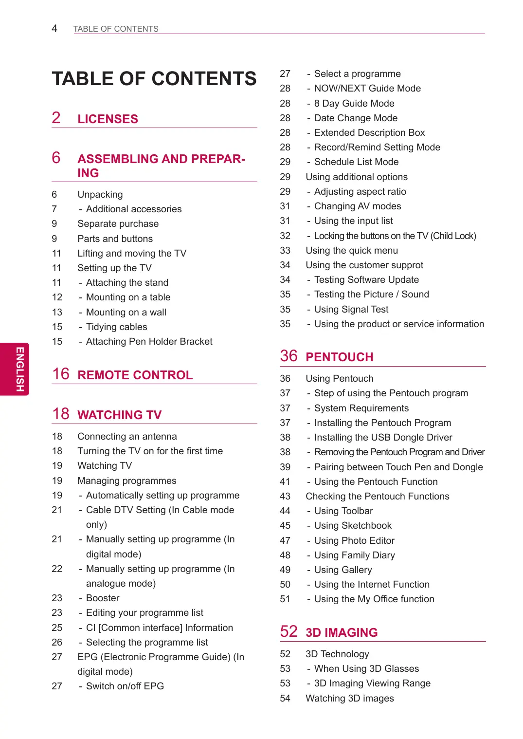 SO J Touch pen dongle Touch pen (AG- s236 RG: 18280 AG-S270 : Only 3D Models) (AN-TD200) (AN-TP200) The model name or design may be changed depending on the upgrade of product functions, manufacturers circumstances or policies. Parts and buttons O NOTE + TV can be placed in standby mode in order to reduce the power consumption. And TV should be turned off if it will not be watched for some time, as this will reduce energy consumption. + The energy consumed during use can be significantly reduced if the level of brightness of the picture is reduced, and this will reduce the overall running cost. A CAUTION + Do not step on the glass stand or subject it to any impact. It may break, causing possible injury from fragments of glass, or the TV may fall. + Do not drag the TV. The floor or the product may be damaged. + In case of some model, the thin film on screen is a part of TV. So don't take it off. HSTION3
