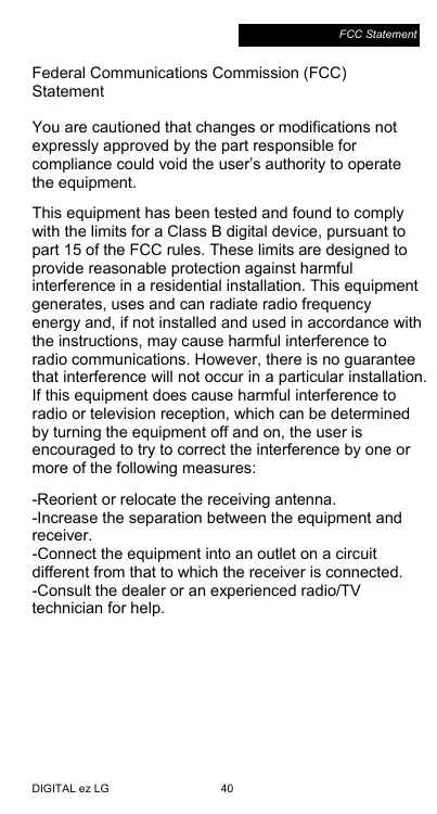 -Reorient or relocate the receiving antenna. -increase the separation between the equipment and receiver.