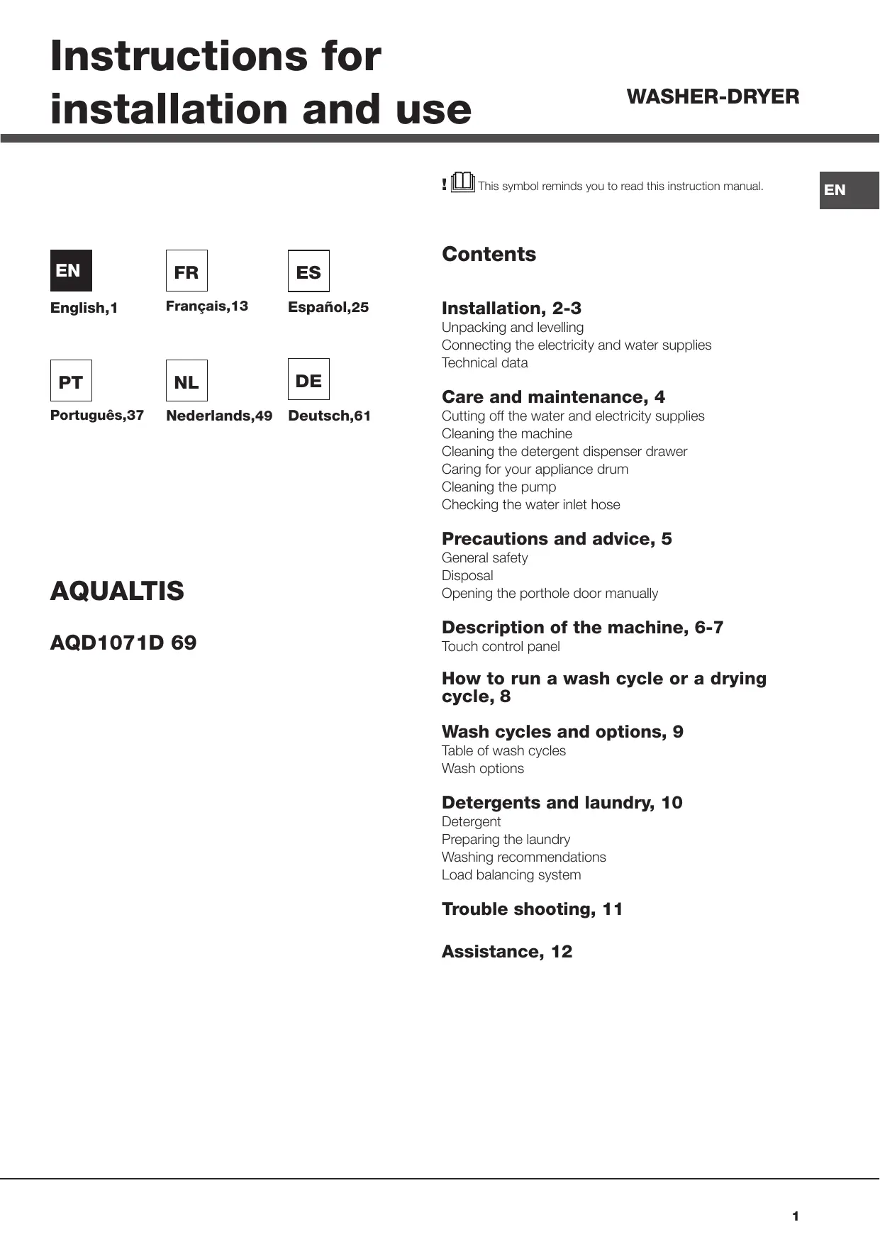 WASHER-DRYER This symbol reminds you to read this instruction manual.