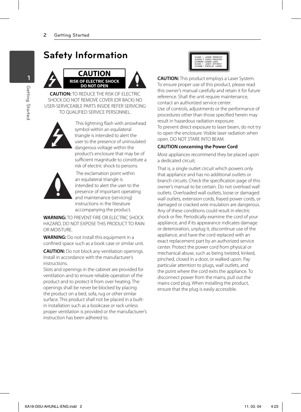 CAUTION: This product employs a Laser System. To ensure proper use of this product, please read this owner's manual carefully and retain it for future reference. Shall the unit require maintenance, contact an authorized service center. Use of controls, adjustments or the performance of procedures other than those specified herein may result in hazardous radiation exposure. To prevent direct exposure to laser beam, do not try to open the enclosure. Visible laser radiation when open. DO NOT STARE INTO BEAM.
