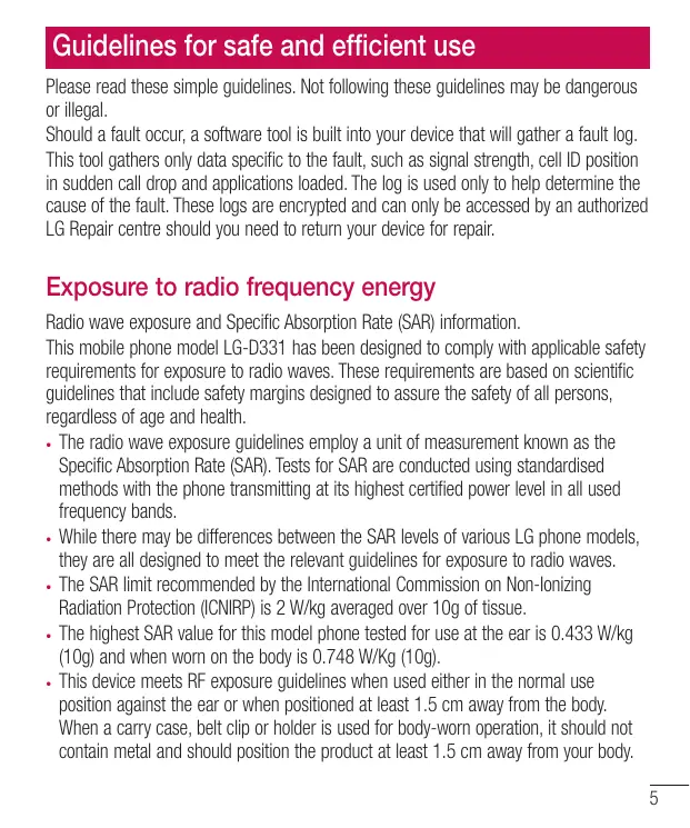 Please read these simple guidelines. Not following these guidelines may be dangerous or illegal. Should a fault occur, a software tool is built into your device that will gather a faut log. This tool gathers only data specific to the fault, such as signal strength, cell ID position in sudden call drop and applications loaded. The log is used only to help determine the cause of the fauit. These logs are encrypted and can only be accessed by an authorized LG Repair centre should you need to return your device for repair. Exposure to radio frequency energy Radio wave exposure and Specific Absorption Rate (SAR) information. This mobile phone model LG-D331 has been designed to comply with applicable safety requirements for exposure to radio waves. These requirements are based on scientific guidelines that include safety margins designed to assure the safety of all persons, regardiess of age and health. . The radio wave exposure guidelines employ a unit of measurement known as the Specific Absorption Rate (SAR). Tests for SAR are conducted using standardised methods with the phone transmitting at its highest certifie power level in all used frequency bands. + While there may be differences between the SAR levels of various LG phone models, they are all designed to meet the relevant guidelines for exposure to radio waves. « The SAR limit recommended by the International Commission on Non-lonizing Radiation Protection (ICNIRP) is 2 W/kg averaged over 10g of tissue. « The highest SAR value for this model phone tested for use at the ear is 0.433 W/kg {10g) and when wom on the body is 0.748 W/Kg (10g). . This device meets RF exposure guidelines when used either in the normal use position against the ear or when positioned at least 1.5 cm away from the body. When a carry case, belt clip or holder is used for body-worn operation, it should not contain metal and should position the product at least 1.5 cm away from your body.