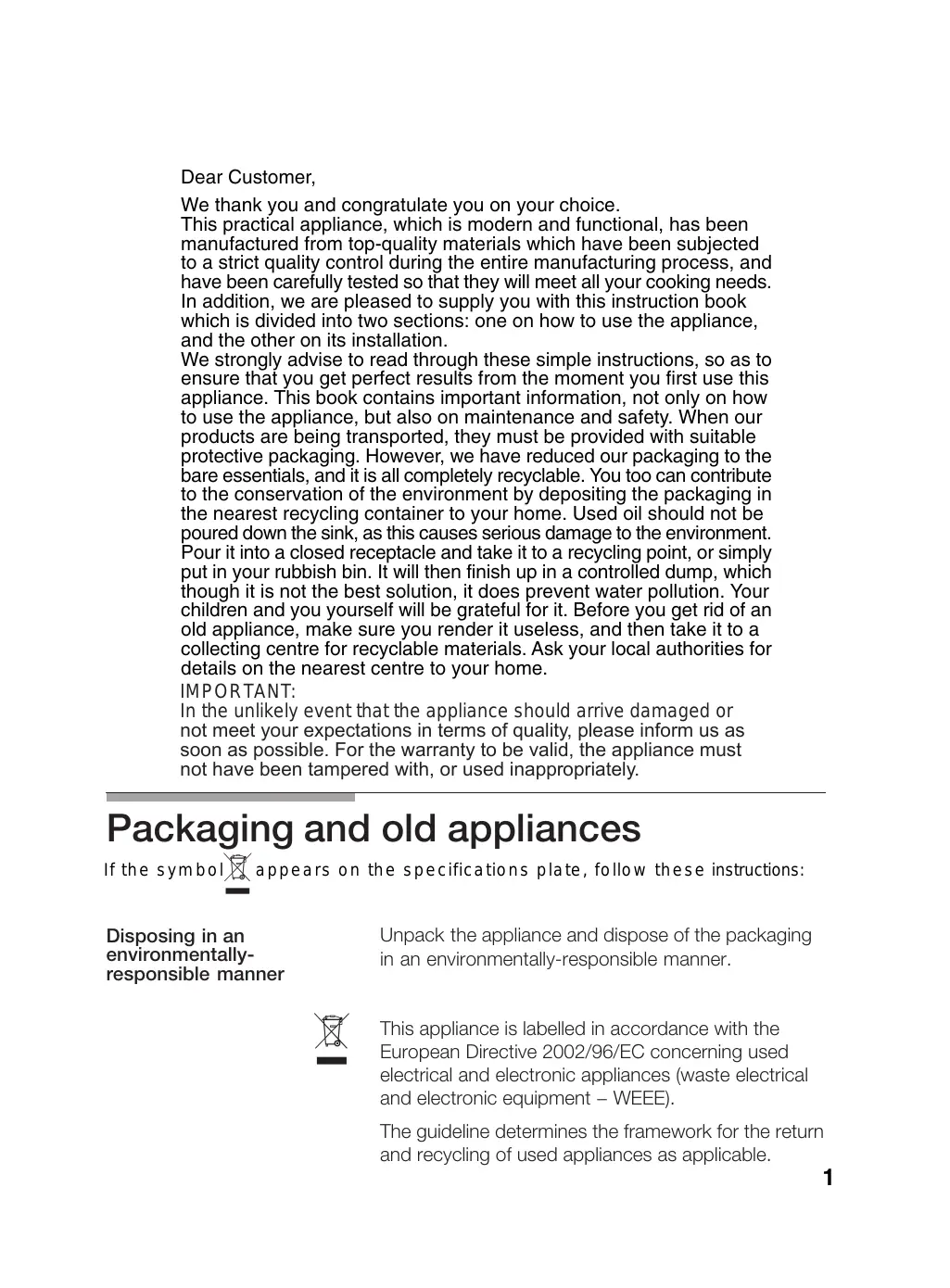 Dear Customer, We thank you and congratulate you on your choice. This practical appliance, which is modern and functional, has been manufactured from top-quality materials which have been subjected to a strict quality control during the entire manufacturing process, and have been careïully tested so that they will meet all your cooking needs. In addition, we are pleased to supply you with this instruction book which is divided into two sections: one on how to use the appliance, and the other on its installation. We strongly advise to read through these simple instructions, so as to ensure that you get perfect results from the moment you first use this appliance. This book contains important information, not only on how to use the appliance, but also on maintenance and safety. When our products are being transported, they must be provided with suitable protective packaging. However, we have reduced our packaging to the bare essentials, and it is all completely recyclable. You too can contribute to the conservation of the environment by depositing the packaging in the nearest recycling container to your home. Used oil should not be poured down the sink, as this causes serious damage to the environment. Pour it into a closed receptacle and take it to a recycling point, or simply put in your rubbish bin. lt will then finish up in a controlled dump, which though it is not the best solution, it does prevent water pollution. Your children and you yourself will be grateful for it. Before you get rid of an old appliance, make sure you render it useless, and then take it to a collecting centre for recyclable materials. Ask your local authorities for details on the nearest centre to your home. IMPORTANT: In the unlikely event that the appliance should arrive damaged or not meet your expectations in terms of quality, please inform us as soon as possible. For the warranty to be valid, the appliance must not have been tampered with, or used inappropriately. Packaging and old appliances Ifthe symbol Ο appears on the specifications plate, follow these instructions: Disposing in an environmentally- responsible manner