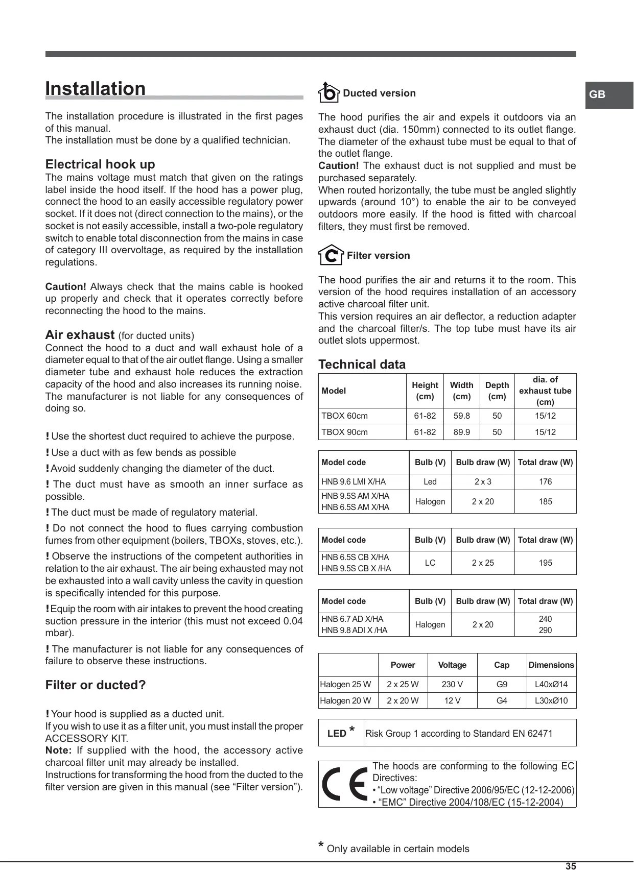 Model code Bulb (V) ! Use the shortest duct required to achieve the purpose. ! Use a duct with as few bends as possible ! The duct must be made of regulatory material. ! Do not connect the hood to flues carrying combustion fumes from other equipment (boilers, TBOXs, stoves, etc.). ! Observe the instructions of the competent authorities in relation to the air exhaust. The air being exhausted may not be exhausted into a wall cavity unless the cavity in question is specifically intended for this purpose. ! Equip the room with air intakes to prevent the hood creating suction pressure in the interior (this must not exceed 0.04 mbar).