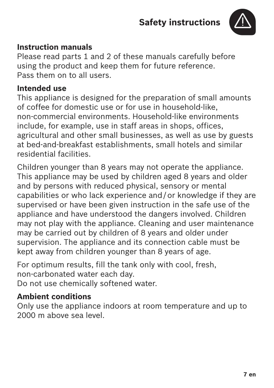 Instruction manuals Please read parts 1 and 2 of these manuals carefully before using the product and keep them for future reference. Pass them on to all users. Intended use This appliance is designed for the preparation of small amounts of coffee for domestic use or for use in household-like, non-commercial environments. Household-like environments include, for example, use in staff areas in shops, offices, agricultural and other small businesses, as well as use by guests at bed-and-breakfast establishments, small hotels and similar residential facilities. Children younger than 8 years may not operate the appliance. This appliance may be used by children aged 8 years and older and by persons with reduced physical, sensory or mental capabilities or who lack experience and / or knowledge if they are supervised or have been given instruction in the safe use of the appliance and have understood the dangers involved. Children may not play with the appliance. Cleaning and user maintenance may be carried out by children of 8 years and older under supervision. The appliance and its connection cable must be kept away from children younger than 8 years of age. For optimum results, fill the tank only with cool, fresh, non-carbonated water each day. Do not use chemically softened water. Ambient conditions Only use the appliance indoors at room temperature and up to 2000 m above sea level.