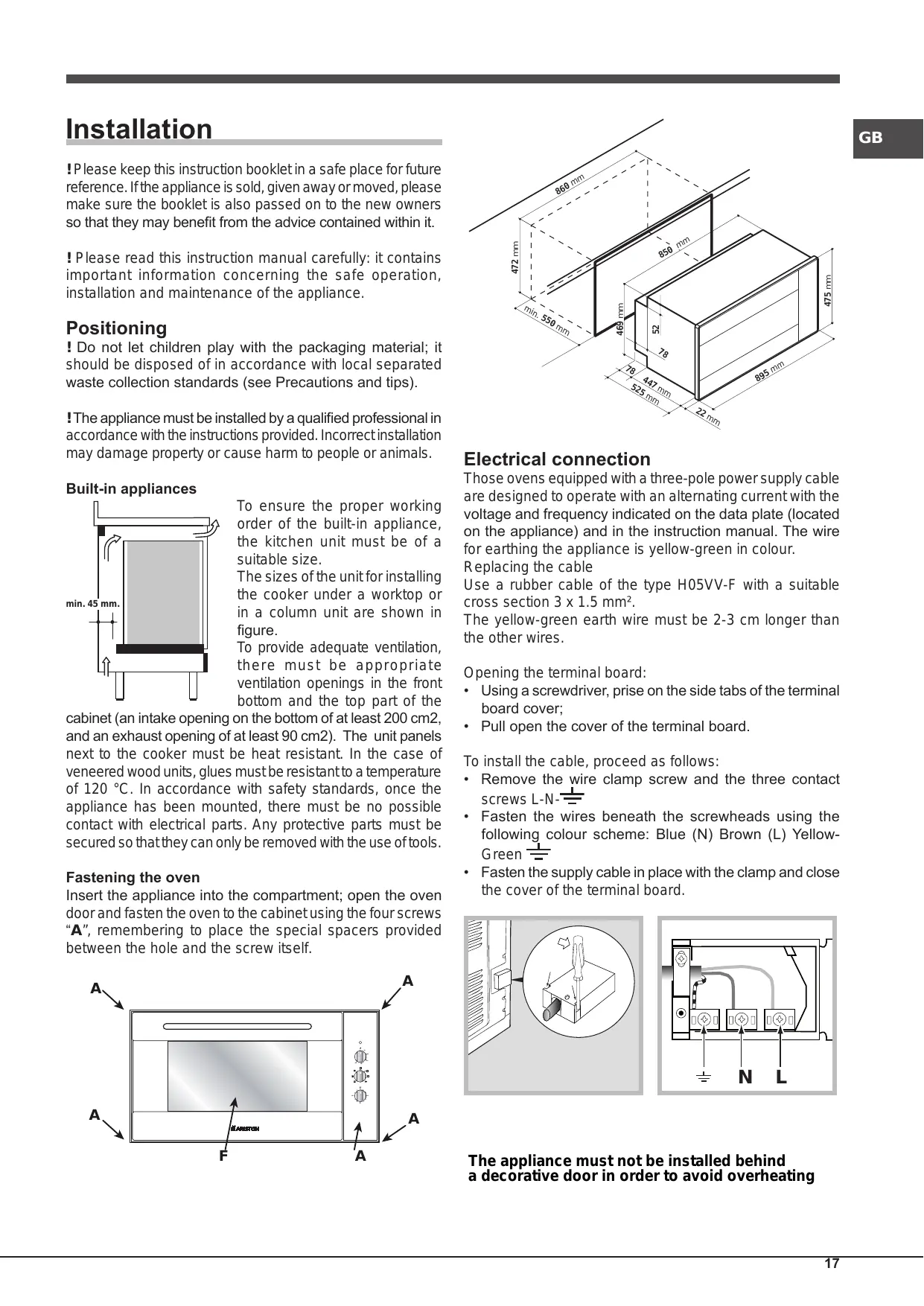 ! The appliance must be installed by a qualified professional in accordance with the instructions provided. Incorrect installation may damage property or cause harm to people or animals. Built-in appliances To ensure the proper working order of the built-in appliance, the kitchen unit must be of a suitable size. The sizes of the unit for installing the cooker under a worktop or min. 45 mm. in a column unit are shown in figure. To provide adequate ventilation, there must be appropriate ventilation openings in the front bottom and the top part of the cabinet (an intake opening on the bottom of at least 200 cm2, and an exhaust opening of at least 90 cm2). The unit panels next to the cooker must be heat resistant. In the case of veneered wood units, glues must be resistant to a temperature of 120 °C. In accordance with safety standards, once the appliance has been mounted, there must be no possible contact with electrical parts. Any protective parts must be secured so that they can only be removed with the use of tools. Fastening the oven Insert the appliance into the compartment; open the oven door and fasten the oven to the cabinet using the four screws “A”, remembering to place the special spacers provided between the hole and the screw itself.
