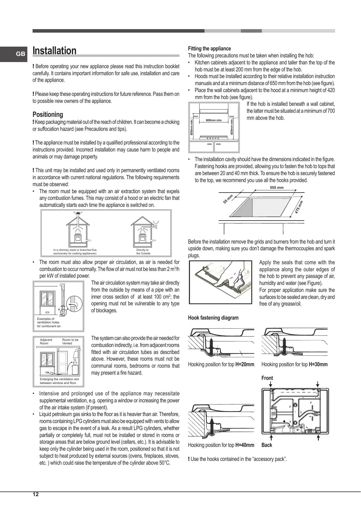 • This is a class 3 built-in appliance. • Gas appliances require regular air exchange to maintain efficient operation. When installing the hob, follow the instructions provided in the paragraph on “Positioning” the appliance. • These instructions are only valid for the countries whose symbols appear in the manual and on the serial number plate. • The appliance was designed for domestic use inside the home and is not intended for commercial or industrial use. • The appliance must not be installed outdoors, even in covered areas. It is extremely dangerous to leave the appliance exposed to rain and storms. • Do not touch the appliance with bare feet or with wet or damp hands and feet. • The appliance must be used by adults only for the preparation of food, in accordance with the instructions outlined in this booklet. Any other use of the appliance (e.g. for heating the room) constitutes improper use and is dangerous. The manufacturer may not be held liable for any damage resulting from improper, incorrect and unreasonable use of the appliance. • Ensure that the power supply cables of other electrical appliances do not come into contact with the hot parts of the oven. • The openings used for ventilation and dispersion of heat must never be covered. • Always make sure the knobs are in the “●”/“○” position when the appliance is not in use. • When unplugging the appliance always pull the plug from the mains socket, do not pull on the cable. • Never carry out any cleaning or maintenance work without having detached the plug from the mains. • In case of malfunction, under no circumstances should you attempt to repair the appliance yourself. Repairs carried out by inexperienced persons may cause injury or further malfunctioning of the appliance. Contact a Service Centre (see Assistance). • Always make sure that pan handles are turned towards the centre of the hob in order to avoid accidental burns. • Do not close the glass cover (if present) when the gas burners or electric hotplates are still hot. • The appliance should not be operated by people (including children) with reduced physical, sensory or mental capacities, by inexperienced individuals or by anyone who is not familiar with the product. These individuals should, at the very least, be supervised by someone who assumes responsibility for their safety or receive preliminary instructions relating to the operation of the appliance. • Do not let children play with the appliance. • The appliance is not intended to be operated by means of an external timer or separate remote-control system.