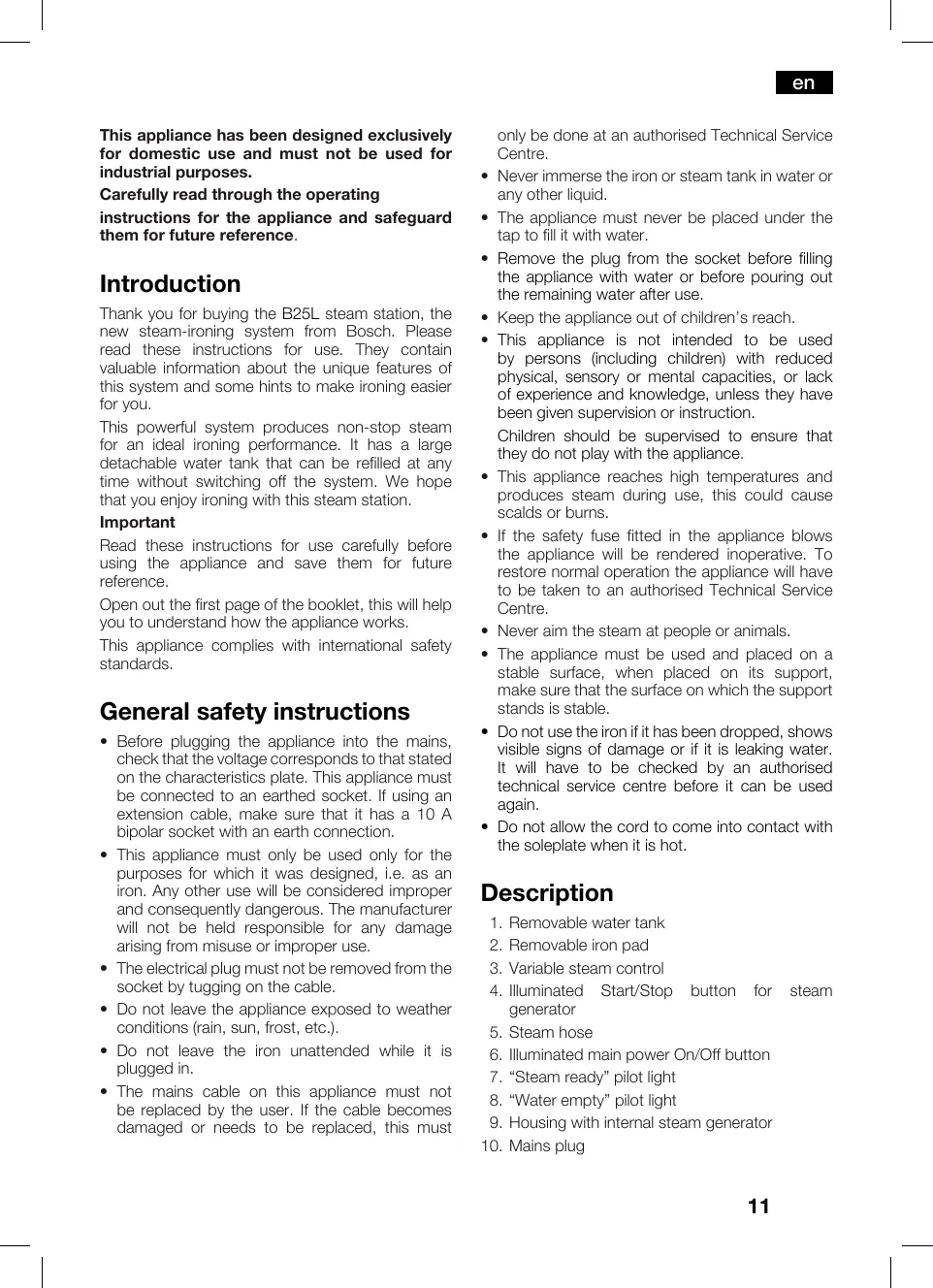 Introduction Thank you for buying the B25L steam station, the new steam-ironing system from Bosch. Please read these instructions for use. They contain valuable information about the unique features of this system and some hints to make ironing easier for you. This powerful system produces non-stop steam for an ideal ironing performance. It has a large detachable water tank that can be refilled at any time without switching off the system. We hope that you enjoy ironing with this steam station. Important Read these instructions for use carefully before using the appliance and save them for future reference. Open out the first page of the booklet, this will help you to understand how the appliance works. This appliance complies with international safety standards. General safety instructions