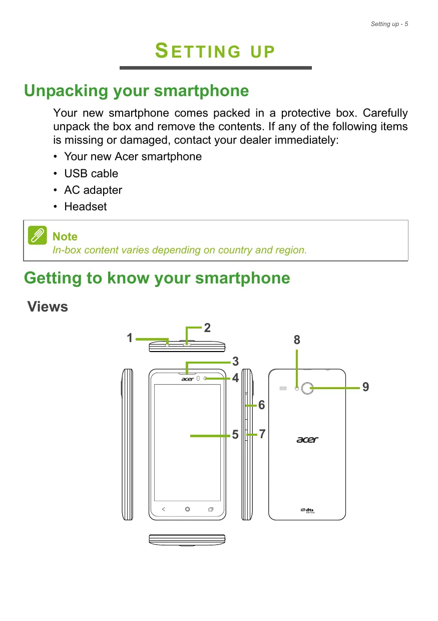 Settng up - 5 SETTING UP Unpacking your smartphone Your new smartphone comes packed in a protective box. Carefully unpack the box and remove the contents. If any of the following items is missing or damaged, contact your dealer immediately: + Your new Acer smartphone + USB cable + AC adapter + Headset Note In-box content varies depending on country and region. Getting to know your smartphone 1 me c—— ET 4 IL6 sl 7 acer < 0 os es.