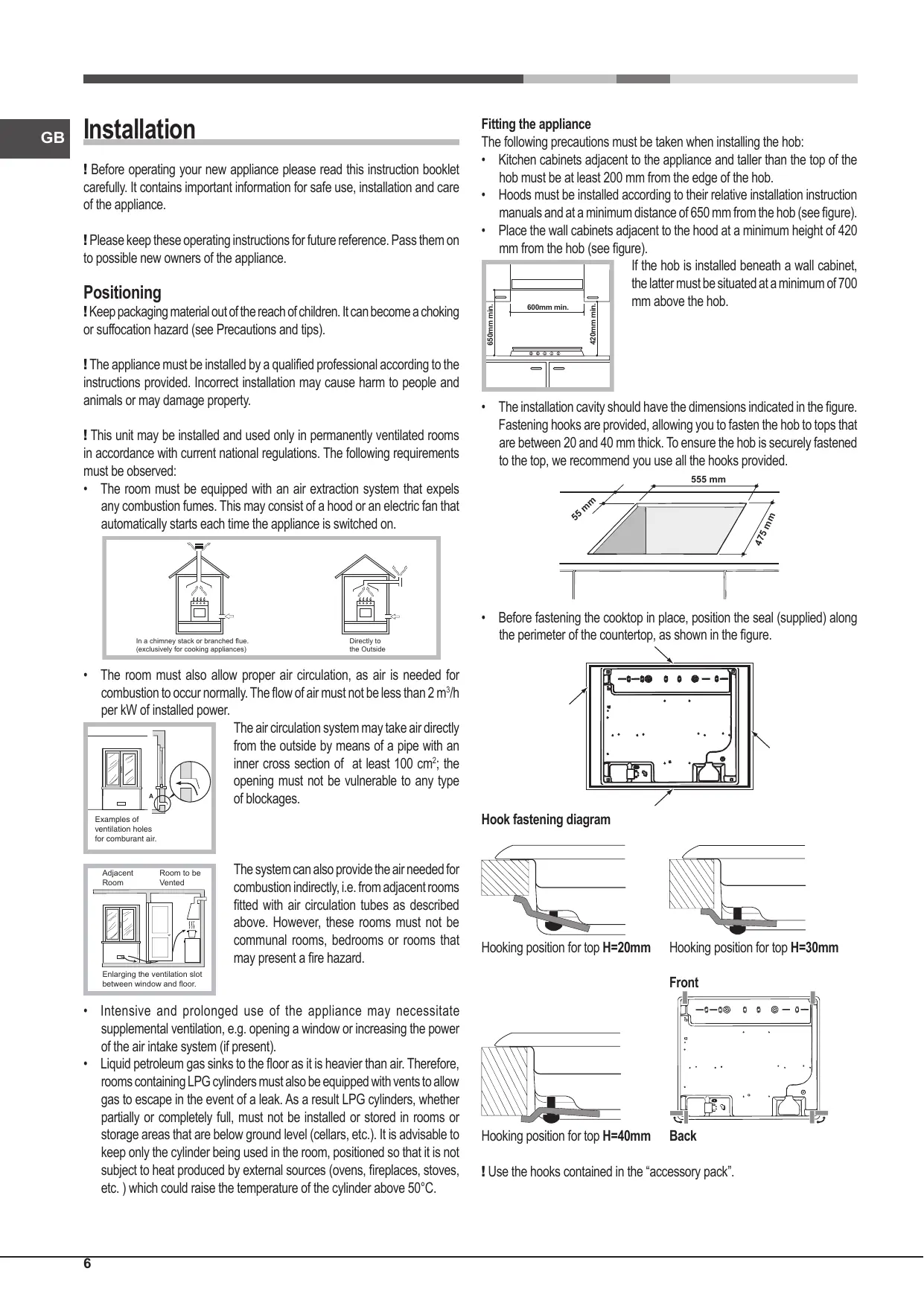 ! The hob can only be installed above built-in ovens with a cooling ventilation system.