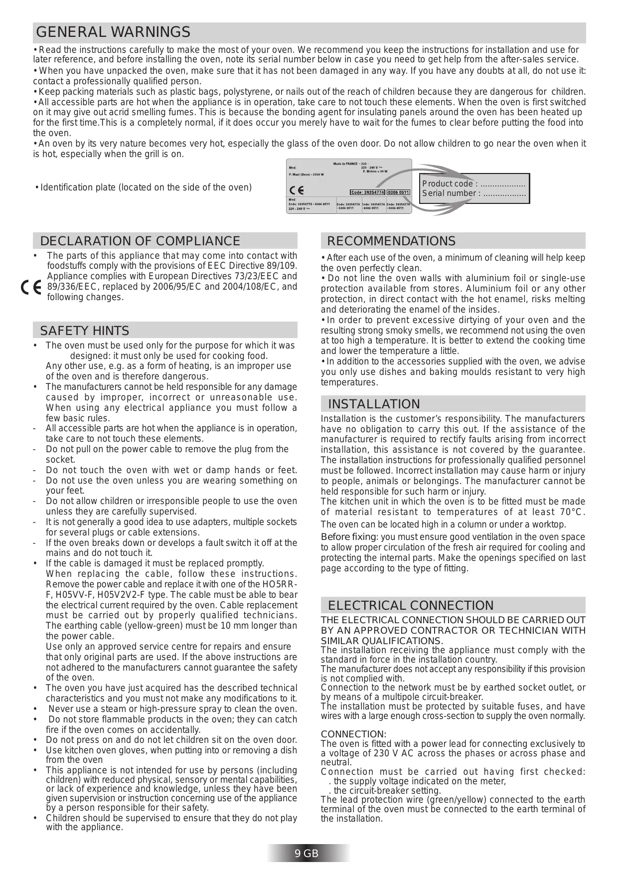 - An oven by its very nature becomes very hot, especially the glass of the oven door. Do not allow children to go near the oven when it is hot, especially when the grill is on. Product code : ................... Serial number : ..................