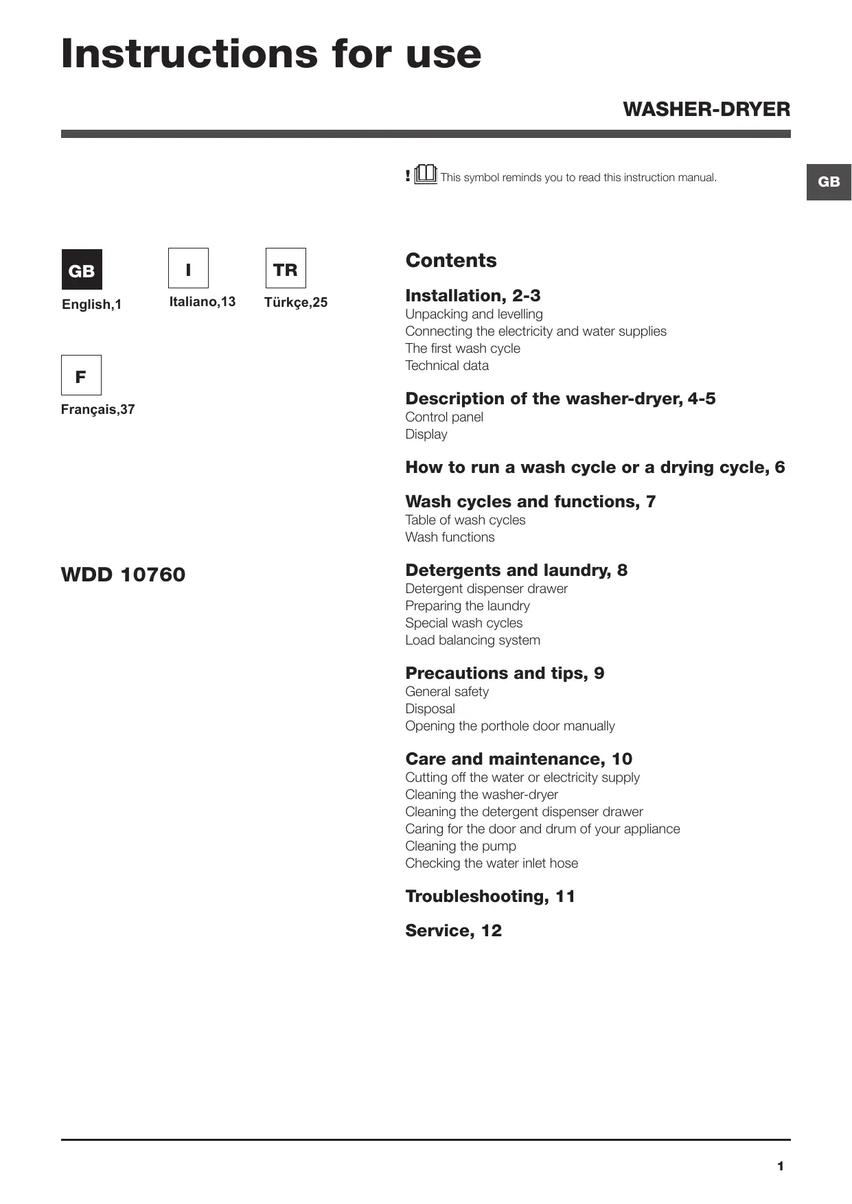 GB Contents Installation, 2-3 Unpacking and levelling Connecting the electricity and water supplies The first wash cycle Technical data