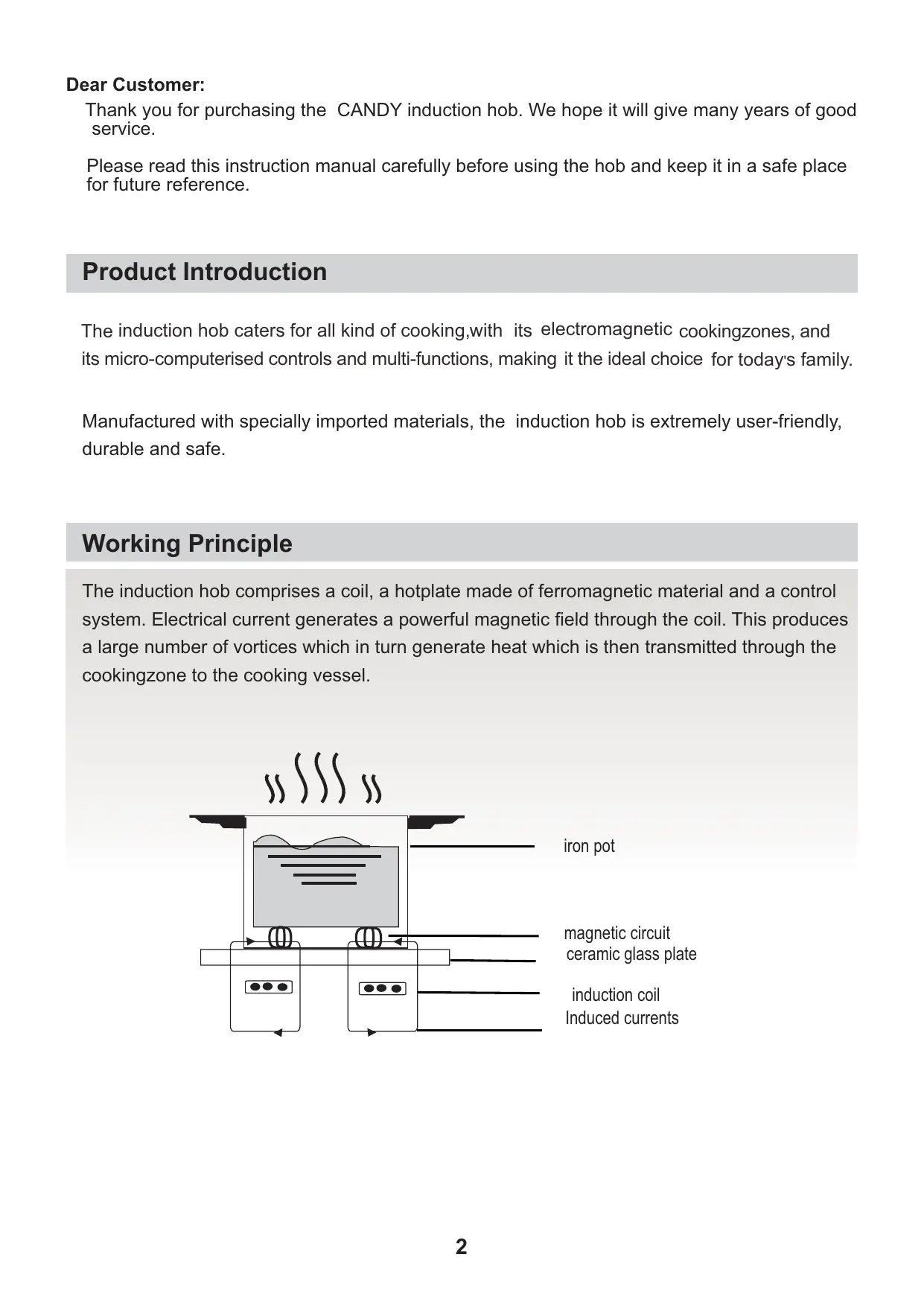 Thank you for purchasing the CANDY induction hob. Please read this instruction manual carefully before using the hob and keep it in a safe place for future reference. Dear Customer: Thank you for purchasing the CANDY induction hob. We hope it will give many years of good service. Please read this instruction manual carefully before using the hob and keep it in a safe place for future reference. Product Introduction R^[ _dZkYj_ed ^eX YWj[hi \eh Wbb a_dZ e\ Yeea_d]1m_j^ _ji [b[YjhecW]d[j_Y Yeea_d]ped[i1 WdZ _ji c_Yhe2Yecfkj[h_i[Z Yedjhebi WdZ ckbj_2\kdYj_edi1 cWa_d] _j j^[ _Z[Wb Y^e_Y[ \eh jeZWo-i \Wc_bo3 Manufactured with specially imported materials, the induction hob is extremely user-friendly, durable and safe. Working Principle The induction hob comprises a coil, a hotplate made of ferromagnetic material and a control system. Electrical current generates a powerful magnetic field through the coil. This produces a large number of vortices which in turn generate heat which is then transmitted through the cookingzone to the cooking vessel. iron pot magnetic circuit ceramic glass plate induction coil Induced currents