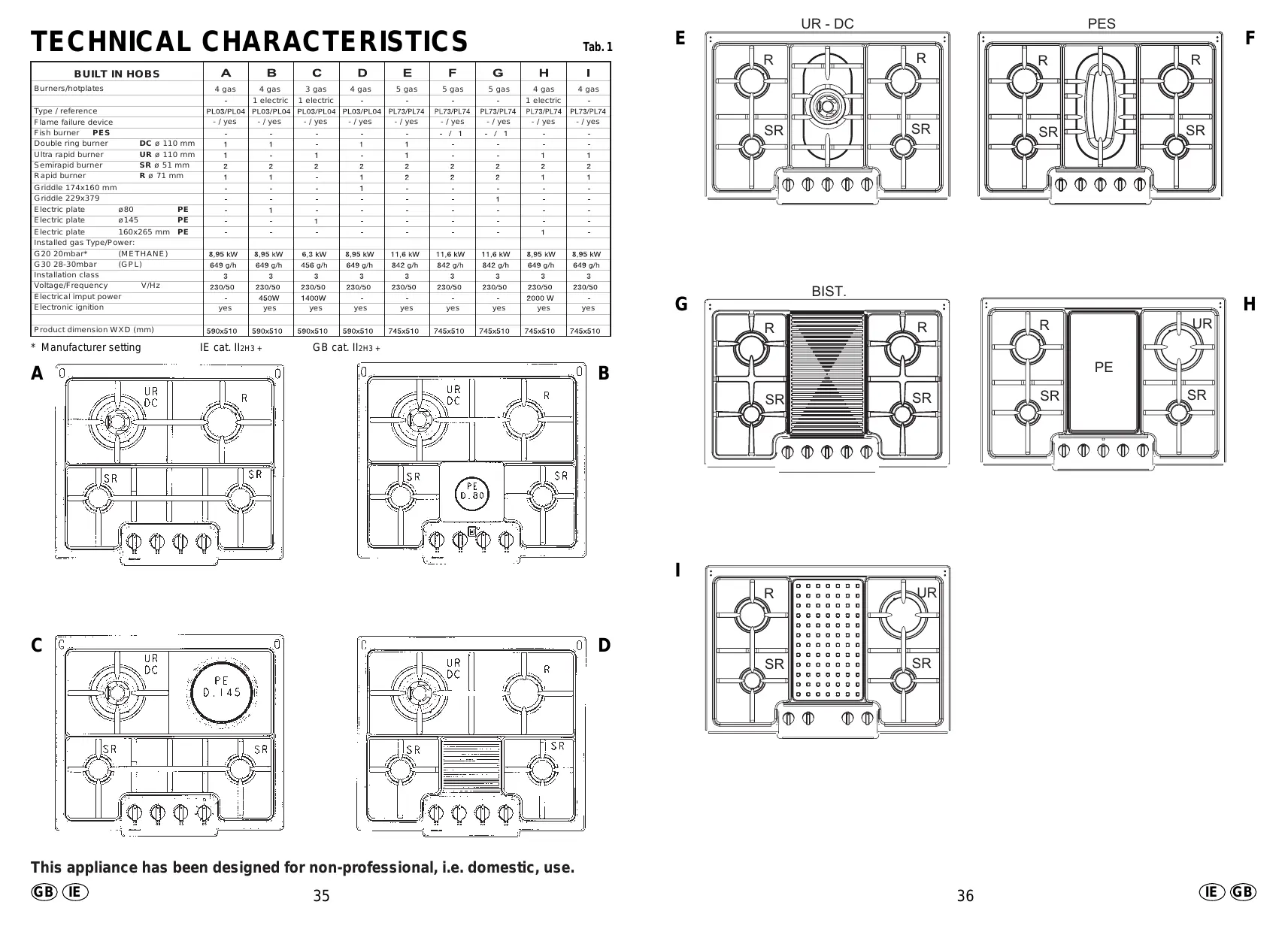 - ignite the burner by pressing the sparker button. For hobs fitted with automatic ignition simply push in and turn the knob to the ★ symbol. The ignition system will continue to generate sparks as long as the gas tap is being pressed. If the burner is not ignited within 5 seconds, turn the knob to the 0 position and repeat the operation. For models fitted with a safety tap (which cuts-off the flow of gas if the flame is accidentally extinguished) the burners are ignited ad described above, but care must be taken to keep the knob pressed in for 5 or 6 seconds after the flame is ignited. ATTENTION: Prior to switching on the gas hob ensure that the burners and burner caps are correctly placed within their position. GENERAL ADVICE For the best results, the flat-bottomed pans size should match the gas burner size as follows. See fig. pag. 35-36. Hob type A;B;C;D;E;F;G;H;I. A;B;C;D;E;F;G;H;I. A;B;C;D;E;F;G; H;I. A;B;C;D; E;F;G;H;I.
