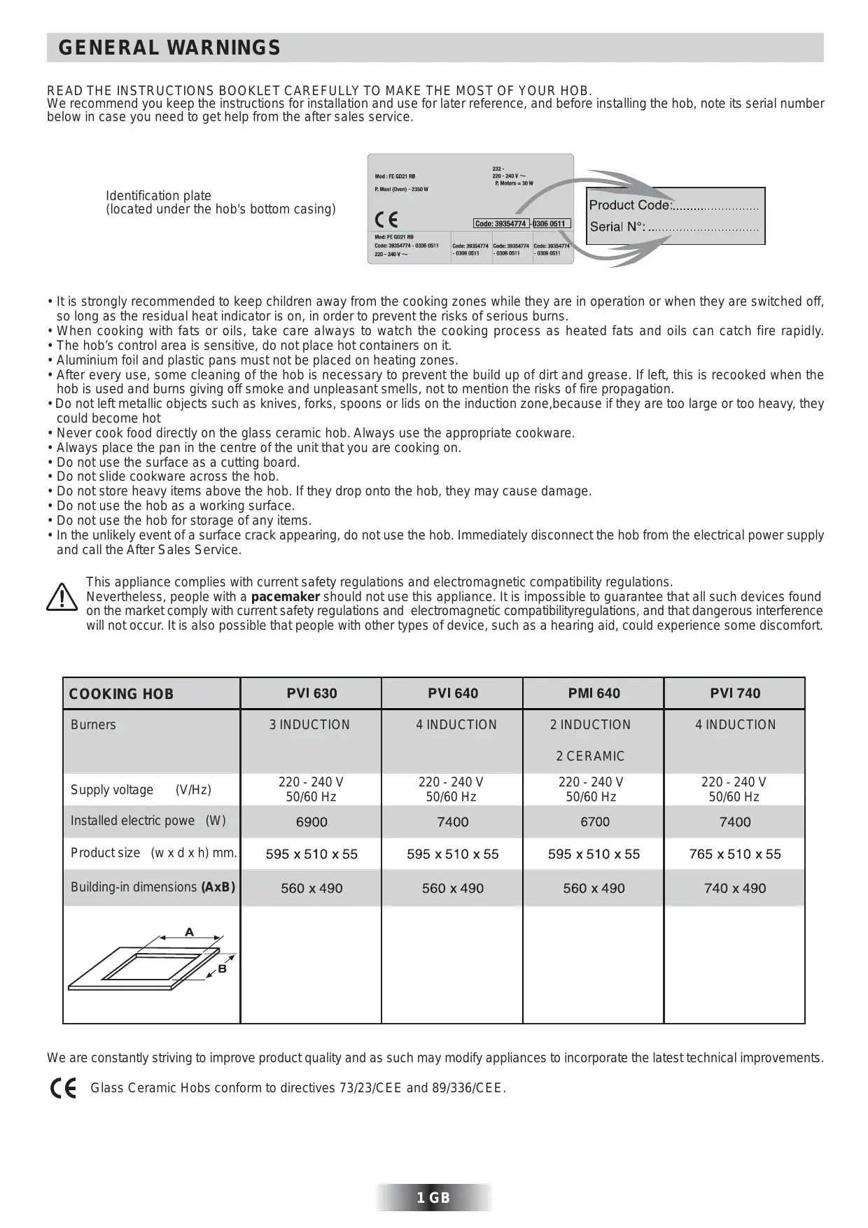 50/60 Hz Installed electric powe (W) Product size (w x d x h) mm. Building-in dimensions (AxB) We are constantly striving to improve product quality and as such may modify appliances to incorporate the latest technical improvements. Glass Ceramic Hobs conform to directives 73/23/CEE and 89/336/CEE. 1 GB INSTALLATION Installing a domestic appliance can be a complicated operation which if not carried out correctly, can seriously affect consumer safety. It is for this reason that the task should be undertaken by a professionally qualified person who will carry it out in accordance with the technical regulations in force. In the event that this advice is ignored and the installation is carried out by an unqualified person, the manufacturer declines all responsibility for any technical failure of the product whether or not it results in damage to goods or injury to individuals. The hob is fitted with a power supply cord which allows it to be BUILT-IN connected only to a power supply of 220-240 V between phases or between phase and neutral. The furniture in which your hob will be installed and all adjacent furniture, should be made from materials that can withstand high