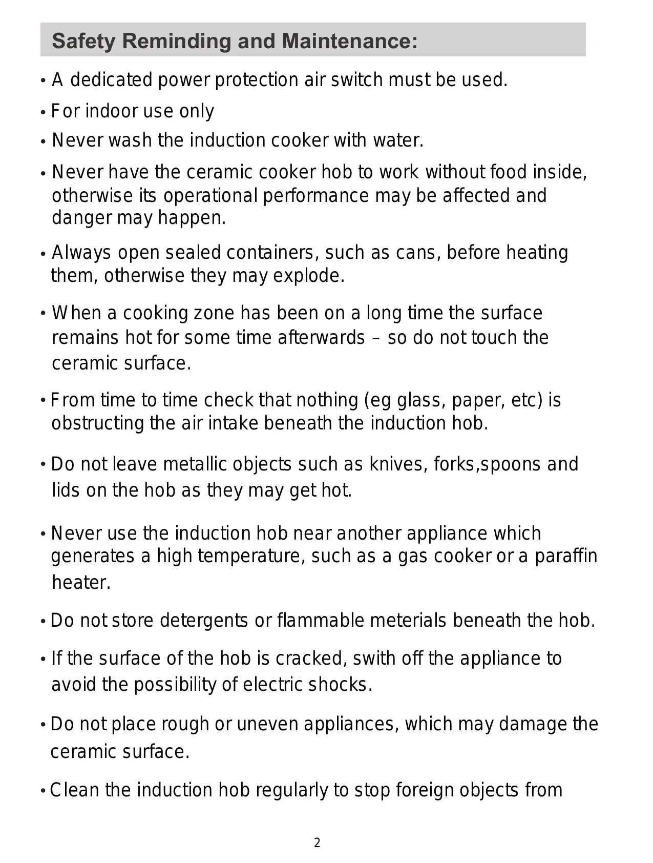 Thank you for purchasing the CANDY induction hob. Please read this instruction manual carefully before using the hob and keep it in a safe place for future reference. LSXWfk KW_[`V[`Y S`V GS[`fW`S`UW= A dedicated power protection air switch must be used. For indoor use only Never wash the induction cooker with water. Never have the ceramic cooker hob to work without food inside, otherwise its operational performance may be affected and danger may happen. Always open sealed containers, such as cans, before heating them, otherwise they may explode. When a cooking zone has been on a long time the surface remains hot for some time afterwards – so do not touch the ceramic surface. From time to time check that nothing (eg glass, paper, etc) is obstructing the air intake beneath the induction hob. Do not leave metallic objects such as knives, forks,spoons and lids on the hob as they may get hot. Never use the induction hob near another appliance which generates a high temperature, such as a gas cooker or a paraffin heater. Do not store detergents or flammable meterials beneath the hob. If the surface of the hob is cracked, swith off the appliance to avoid the possibility of electric shocks. Do not place rough or uneven appliances, which may damage the ceramic surface. Clean the induction hob regularly to stop foreign objects from