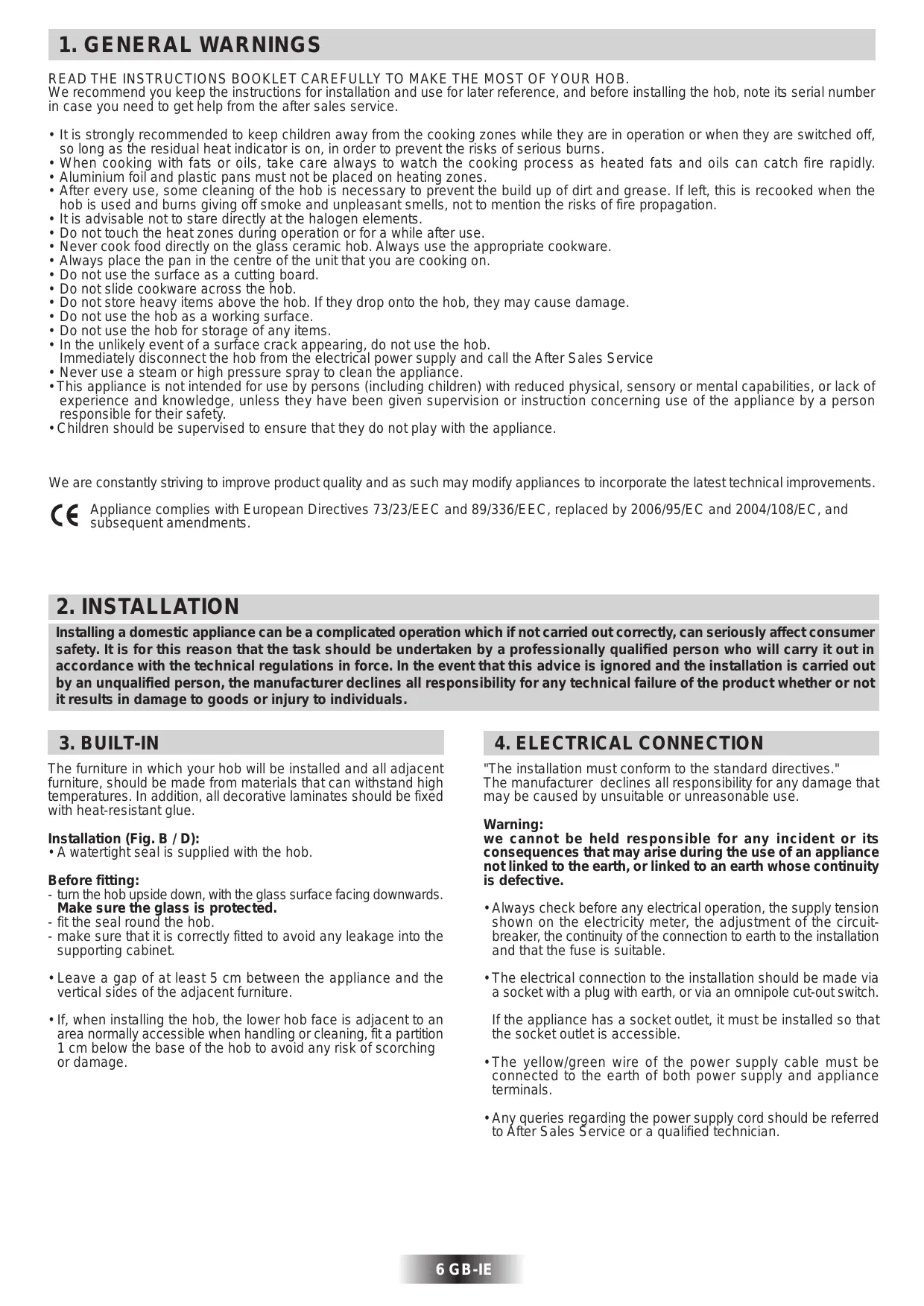 - Do not slide cookware across the hob. + Do not store heavy items above the hob. If they drop onto the hob, they may cause damage. + Do not use the hob as a working surface. + Do not use the hob for storage of any items. + In the unlikely event of a surface crack appearing, do not use the hob. Immediately disconnect the hob from the electrical power supply and call the After Sales Service + Never use à steam or high pressure spray to clean the appliance. This appliance is not intended for use by persons (including children) with reduced physical, sensory or mental capabilities, or lack of experience and knowledge, unless they have been given supervision or instruction concerning use of the appliance by a person responsible for their safety. + Children should be supervised to ensure that they do not play with the appliance. We are constantly striving to improve product quality and as such may modify appliances to incorporate the latest technical improvements ce Appliance complies with European Directives 73/23/EEC and 89/336/EEC, replaced by 2006/95/EC and 2004/108/EC, and subsequent amendments.