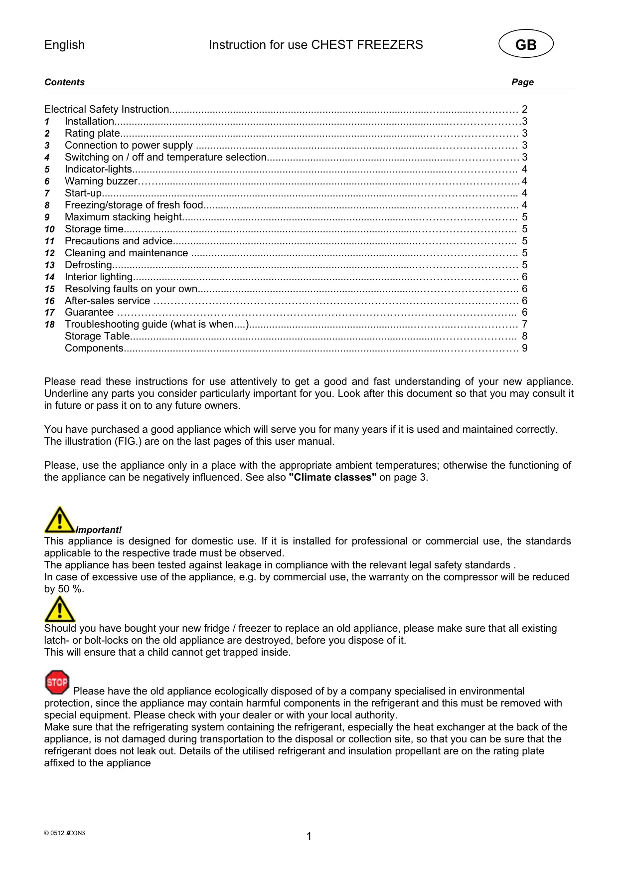 Page Electrical Safety Instruction..........................................................................................…...........…….……. 2 Installation....................................................................................................................…………………3 Rating plate..........................................................................................................……………………… 3 Connection to power supply ...................................................................................…………………… 3 Switching on / off and temperature selection.................................................................………………. 3 Indicator-lights..............................................................................................................……………….. 4 Warning buzzer……...........................................................................................……………………….. 4 Start-up............................................................................................................…………….…………... 4 Freezing/storage of fresh food...........................................................................……………………….. 4 Maximum stacking height..................................................................................……………………….. 5 10 Storage time......................................................................................................……………………….. 5 11 Precautions and advice.....................................................................................……………………….. 5 12 Cleaning and maintenance ...............................................................................……………………….. 5 13 Defrosting.........................................................................................................………………………… 5 14 Interior lighting..................................................................................................………………………… 6 15 Resolving faults on your own.............................................................................……………………….. 6 16 After-sales service ………………………………………………………………………………….………… 6 17 Guarantee …………………………………………………………………………………………………….. 6 18 Troubleshooting guide (what is when....).........................................................………...………………. 7 Storage Table...........................................................................................................………………….. 8 Components................................................................................................................………………… 9 Please read these instructions for use attentively to get a good and fast understanding of your new appliance. Underline any parts you consider particularly important for you. Look after this document so that you may consult it in future or pass it on to any future owners. You have purchased a good appliance which will serve you for many years if it is used and maintained correctly. The illustration (FIG.) are on the last pages of this user manual. Please, use the appliance only in a place with the appropriate ambient temperatures; otherwise the functioning of the appliance can be negatively influenced. See also "Climate classes" on page 3. Important! This appliance is designed for domestic use. If it is installed for professional or commercial use, the standards applicable to the respective trade must be observed. The appliance has been tested against leakage in compliance with the relevant legal safety standards . In case of excessive use of the appliance, e.g. by commercial use, the warranty on the compressor will be reduced by 50 %. Should you have bought your new fridge / freezer to replace an old appliance, please make sure that all existing latch- or bolt-locks on the old appliance are destroyed, before you dispose of it. This will ensure that a child cannot get trapped inside. Please have the old appliance ecologically disposed of by a company specialised in environmental protection, since the appliance may contain harmful components in the refrigerant and this must be removed with special equipment. Please check with your dealer or with your local authority. Make sure that the refrigerating system containing the refrigerant, especially the heat exchanger at the back of the appliance, is not damaged during transportation to the disposal or collection site, so that you can be sure that the refrigerant does not leak out. Details of the utilised refrigerant and insulation propellant are on the rating plate affixed to the appliance © 0512 fiCONS