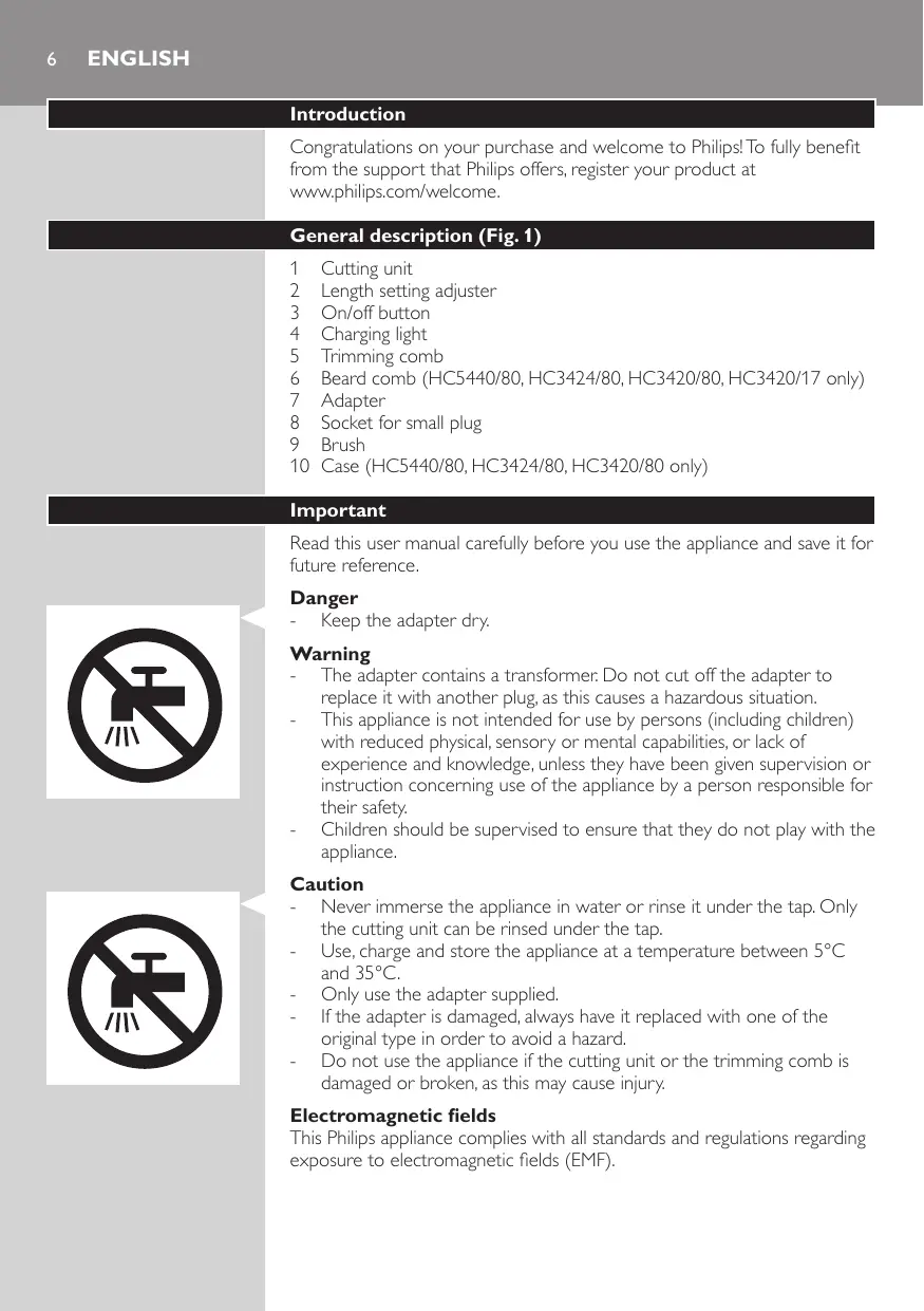 Note: Only the cutting element and the comb can be cleaned with water.