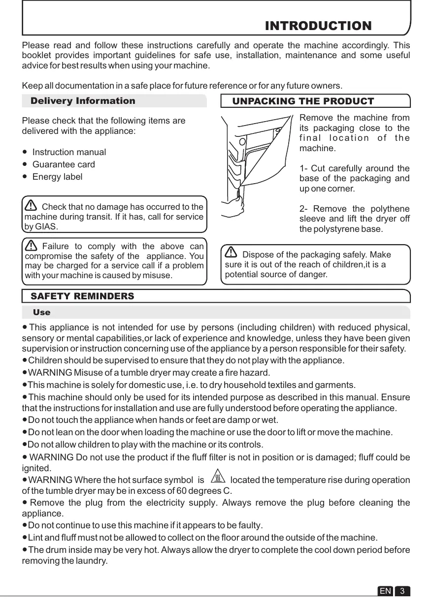 INTRODUCTION Please read and follow these instructions carefully and operate the machine accordingly. This booklet provides important guidelines for safe use, installation, maintenance and some useful advice for best results when using your machine. Keep all documentation in a safe place for future reference or for any future owners. Delivery Information Please check that the following items are delivered with the appliance: ● Instruction manual ● Guarantee card ● Energy label Check that no damage has occurred to the machine during transit. If it has, call for service by GIAS. Failure to comply with the above can compromise the safety of the appliance. You may be charged for a service call if a problem with your machine is caused by misuse.