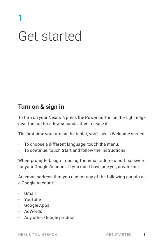 Get started Turn on & sign in To turn on your Nexus 7, press the Power button on the right edge near the top for a few seconds, then release it The first time you turn on the tablet, you'll see a Welcome screen. + To choose a different language, touch the menu: +. To continue, touch Start and follow the instructions. When prompted, sign in using the email address and password for your Google Account. If you don't have one yet, create one. An email address that you use for any of the following counts as a Google Account: + Gmail + YouTube + Google Apps + AdWords + Any other Google product NEXUS 7 GUIDEBOOK