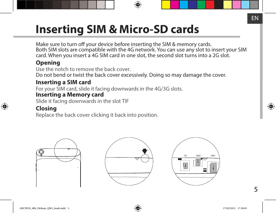 1 ON/OFF button 5 Volume buttons 9 Flash light 2 Webcam 6 Microphone 10 Headphone jack 3 Loudspeaker 7 Micro-USB port 11 Loudspeaker 4 Brightness sensor 8 Camera Inserting SIM & Micro-SD cards Make sure to turn off your device before inserting the SIM & memory cards. Both SIM slots are compatible with the 4G network. You can use any slot to insert your SIM card. When you insert a 4G SIM card in one slot, the second slot turns into a 2G slot. Opening Use the notch to remove the back cover. Do not bend or twist the back cover excessively. Doing so may damage the cover. Inserting a SIM card For your SIM card, slide it facing downwards in the 4G/3G slots. Inserting a Memory card Slide it facing downwards in the slot TIF Closing Replace the back cover clicking it back into position. TIF SIM2 SIM1 TIF SIM2 SIM1 4G & WiFi connection 4G connection To be able to access Internet, the mobile data icon must be activated. Activating the mobile data