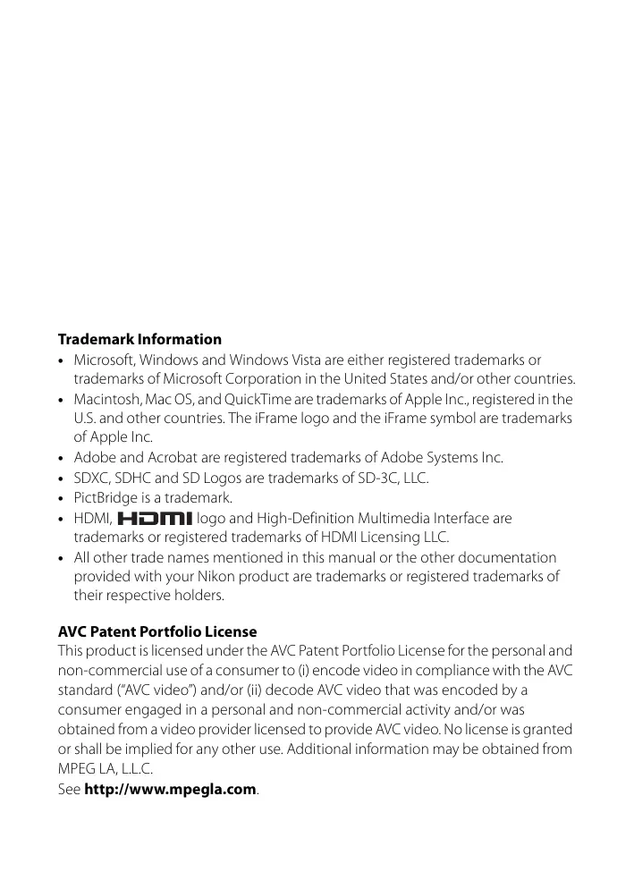 Trademark Information Microsoft, Windows and Windows Vista are either registered trademarks or trademarks of Microsoft Corporation in the United States and/or other countries. Macintosh, Mac OS, and QuickTime are trademarks of Apple Inc, registered in the US. and other countries, The iFrame logo and the iFrame symbol are trademarks of Apple Inc Adobe and Acrobat are registered trademarks of Adobe Systems Inc. SDXC, SDHC and SD Logos are trademarks of SD-3C, LLC. PictBridge is a trademark. HDMI, MDI logo and High-Definition Multimedia Interface are trademarks or registered trademarks of HDMI Licensing LLC. All other trade names mentioned in this manual or the other documentation provided with your Nikon product are trademarks or registered trademarks of their respective holders. AVC Patent Portfolio License This product is licensed under the AVC Patent Portfolio License for the personal and non-commercial use of a consumer to (i) encode video in compliance with the AVC standard (‘AVC video”) and/or (ii) decode AVC video that was encoded by a consumer engaged in a personal and non-commercial activity and/or was obtained from a video provider licensed to provide AVC video. No license is granted or shall be implied for any other use. Additional information may be obtained from MPEG LA, LLC. See http:/www.mpegla.com.