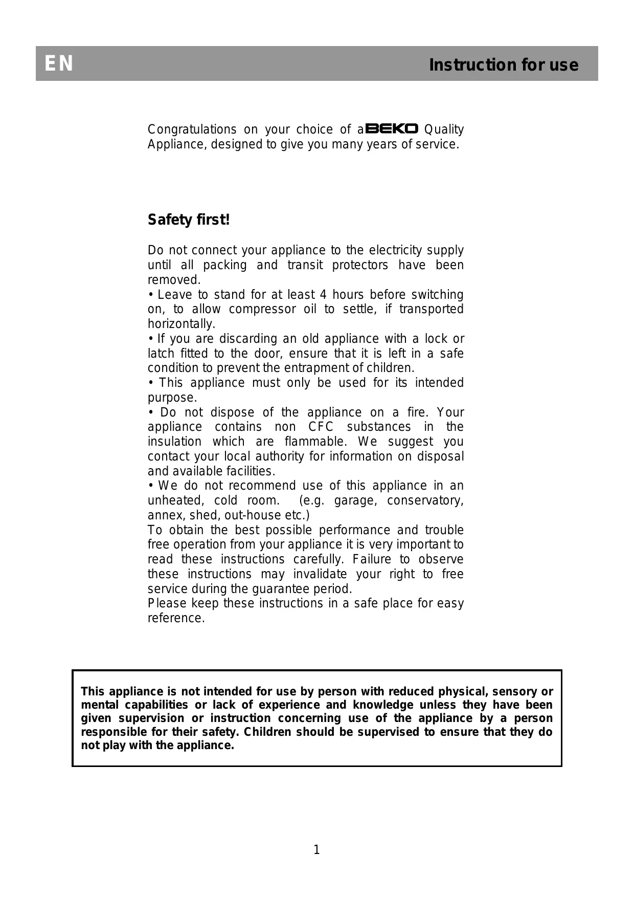 - We do not recommend use of this appliance in an unheated, cold room. (e.g. garage, conservatory, annex, shed, out-house etc.) To obtain the best possible performance and trouble free operation from your appliance it is very important to read these instructions carefully. Failure to observe these instructions may invalidate your right to free service during the guarantee period. Please keep these instructions in a safe place for easy reference. This appliance is not intended for use by person with reduced physical, sensory or mental capabilities or lack of experience and knowledge unless they have been given supervision or instruction concerning use of the appliance by a person responsible for their safety. Children should be supervised to ensure that they do not play with the appliance.