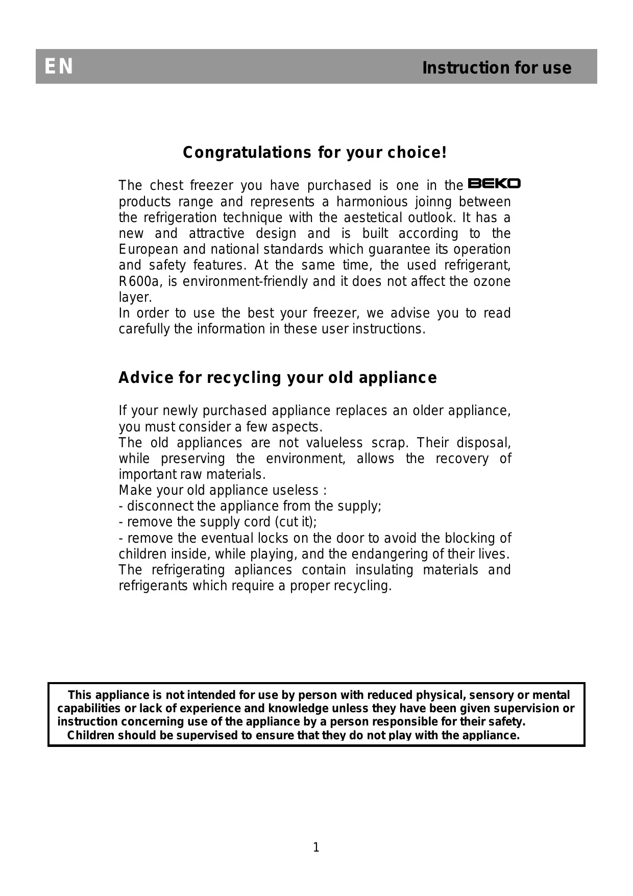 Pour une meilleure utilisation de votre congélateur, nous vous conseillons de lire attentivement cette notice.