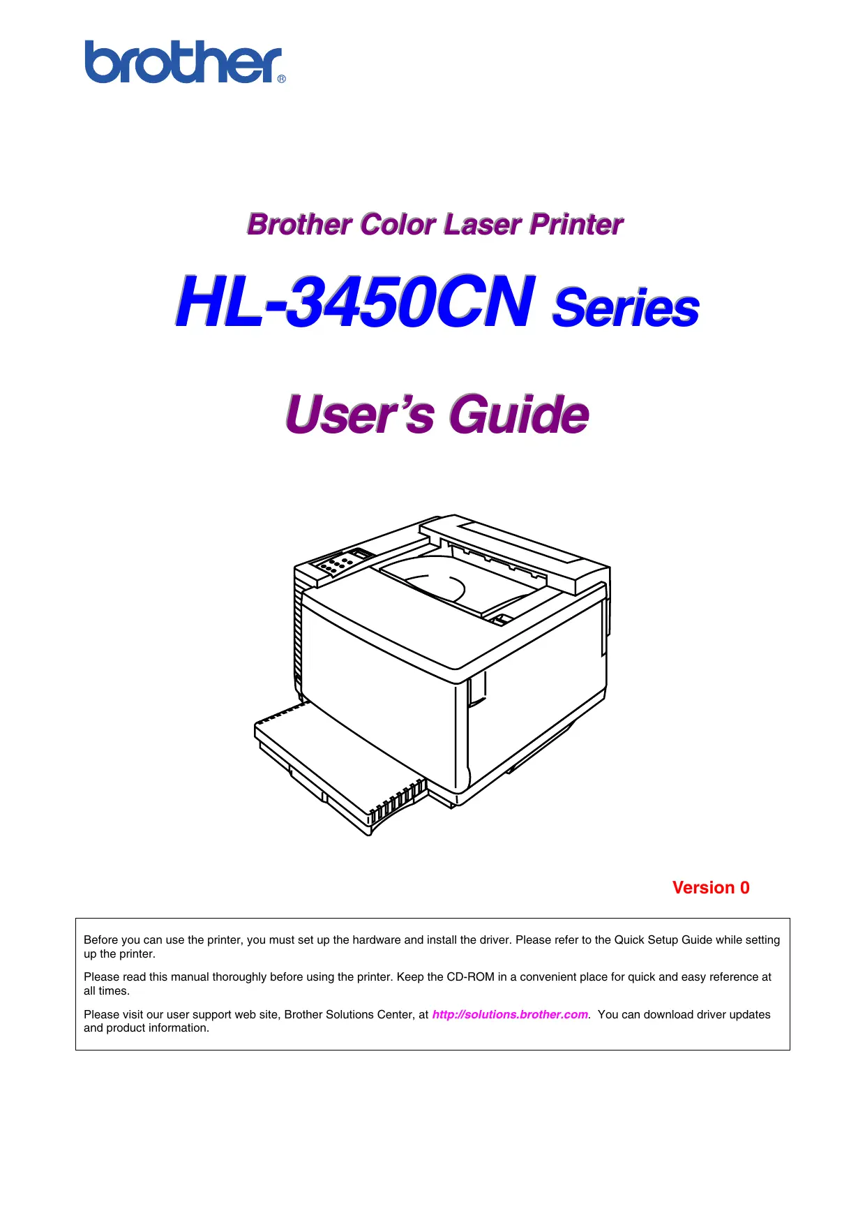 LI 11111111 Version 0 Before you can use the printer, you must set up the hardware and install the driver. Please refer to the Quick Setup Guide while setting up the printer. Please read this manual thoroughly before using the printer. Keep the CD-ROM in a convenient place for quick and easy reference at all times. Please visit our user support web site, Brother Solutions Center, at hftp:/solutions.brother.com. You can download driver updates and product information.