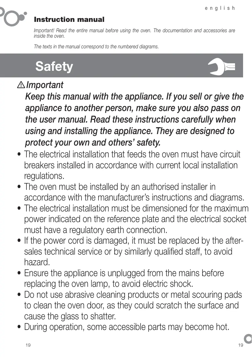 Important Keep this manual with the appliance. If you sell or give the appliance to another person, make sure you also pass on the user manual. Read these instructions carefully when using and installing the appliance. They are designed to protect your own and others’ safety. The electrical installation that feeds the oven must have circuit breakers installed in accordance with current local installation regulations. The oven must be installed by an authorised installer in accordance with the manufacturer’s instructions and diagrams. The electrical installation must be dimensioned for the maximum power indicated on the reference plate and the electrical socket must have a regulatory earth connection. If the power cord is damaged, it must be replaced by the aftersales technical service or by similarly qualified staff, to avoid hazard. Ensure the appliance is unplugged from the mains before replacing the oven lamp, to avoid electric shock. Do not use abrasive cleaning products or metal scouring pads to clean the oven door, as they could scratch the surface and cause the glass to shatter. During operation, some accessible parts may become hot.