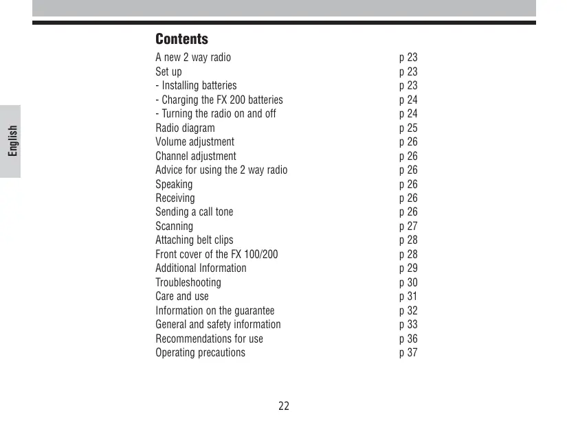 A new 2 way radio Set up - Installing batteries - Charging the FX 200 batteries - Turning the radio on and off Radio diagram Volume adjustment Channel adjustment Advice for using the 2 way radio Speaking Receiving Sending a call tone Scanning Attaching belt clips Front cover of the FX 100/200 Additional Information Troubleshooting Care and use Information on the guarantee General and safety information Recommendations for use Operating precautions