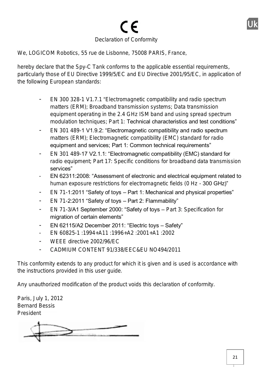 Declaration of Conformity We, LOGICOM Robotics, 55 rue de Lisbonne, 75008 PARIS, France, hereby declare that the Spy-C Tank conforms to the applicable essential requirements, particularly those of EU Directive 1999/5/EC and EU Directive 2001/95/EC, in application of the following European standards: