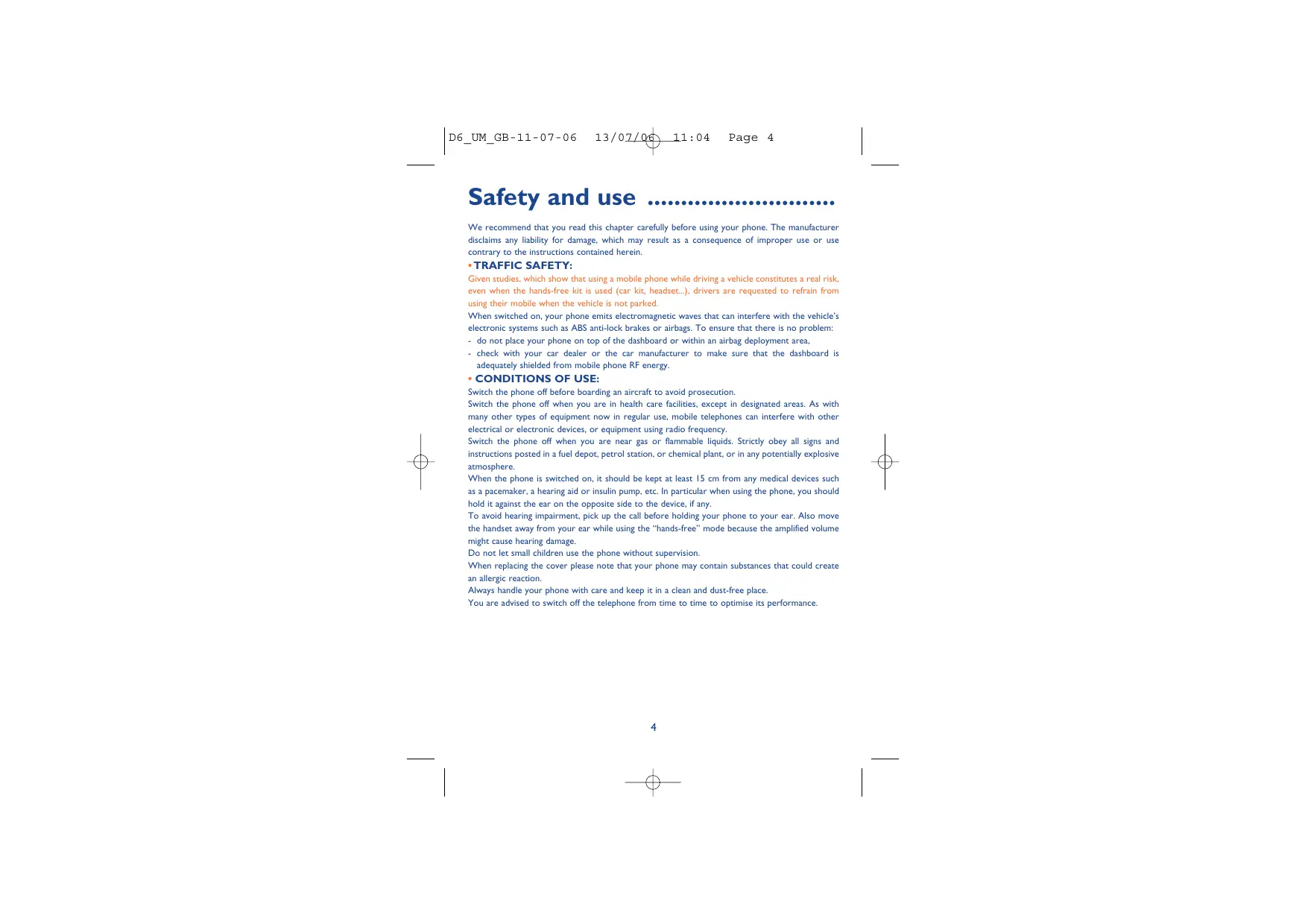 D6_UM_GB-11-07-06 23/02/06 11:04 Page 9 Protection against theft (” Your telephone is identified by an IMEI (phone serial number) shown on the packaging label and in the product's memory. We recommend that you note the number the first time you use your telephone by entering %, #, 0, 6,# and keep it in a safe place. It may be requested by the police or your operator if your telephone is stolen. This number allows your mobile telephone to be blocked preventing a third person from using it, even with a different SIM card. Disclaimer There may be certain differences between the user manual description and the phone's operation, depending on the software release of your telephone or specific operator services. April 2006 4 Contact your network operator to check service availability.