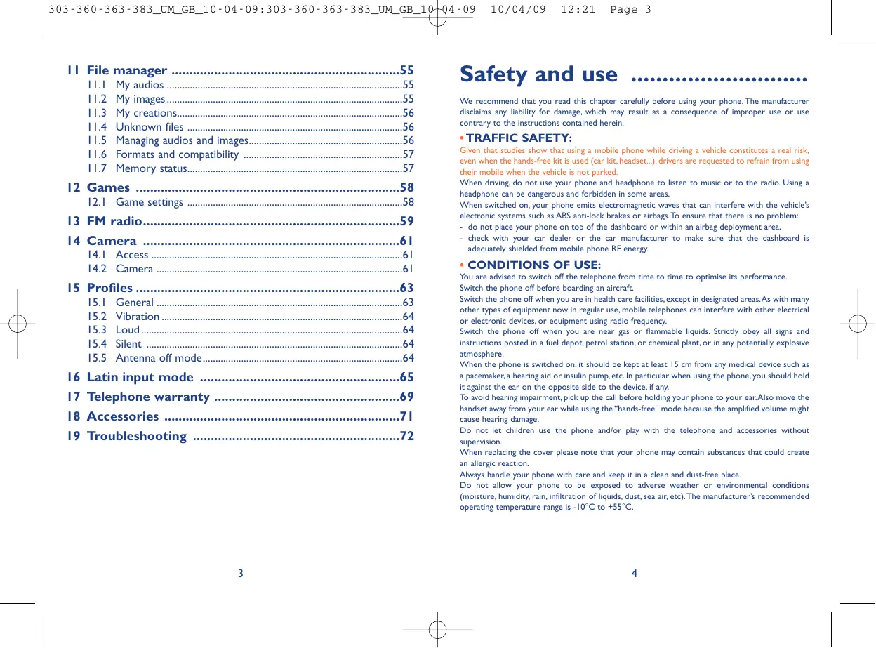 16 Latin input mode 17 Telephone warranty … 18 Accessories 19 Troubleshooting Safety and use . mn Ve recommande red is capter art ble uäg jour phone. The manucure sis any by Le damage er may re as à come ef proper ie or cie near © de meucien crade + TRAFFIC SAFETY: Given that studies show that using a mobile phone while driving a vehicle constitutes à real risk, ‘even when the hands-free kit is used (car Kit, headset..), drivers are requested co refrain from using their mobile when the vehicle is not parked. When drving, do not use your phone and headphone to listen to music or to the radio. Using a headphone can be dangerous and forbidden in some areas. When switched on, your phone emits electromagnetic waves that can incerfere with the vehicles electron systems such as ABS ant-lock brakes or airbags. To ensure that there is no problem: = do not place your phone on top of the dushboard or within an airbag deployment area, = check with your car dealer or the car manufacturer to make sure that the dashboard is adequately shielded from mobile phone RF energy. + CONDITIONS OF USE: ou are advised to switch Of he telephone from time 1 time 10 optimise ts performance. Such he phone of belere boardng an area Such the phone of when you ara in heal ere fcitiesexcpr in deiratad ares A vit any axher pes of equipment nov in reqular use. mobile elephones can Iterere Mc our aerieal er alcconie descs, or equipment Lang rade frequency. Such che phone of when you are ner gs or fammable luds. Suriedy obey all sgns and istrutions posted In a fuel depot pero sation, or chemial pan, oi ay potential explosive sumosphere When the phone s swtchad on ahould be pe at lens 15 em from any media device such 5 à pacamaler a hering ad or ini pump. parcular when ulg he phone.you should hold K agit the ea on the oppose side Lo te device. any To mod bearing impairment pick up &e el belore holding your phone 0 your er Aie move the handiet any fm your eur while Wing he “handsfree* mode because the ampli volume mighe use hey damage De not let children use the phone andor play with the uephone and accessories without When relcig de cover please note tt our phone may comain substances de could create an alergie encor. Aays and your phone with care and keep ii à clean and duree place De not alow jour phene 4 be ogesed 15 verse weather or environmental conditions Amoisure. humiig ran. inflation of us dus. se aie) The manucure recommended operating cemperaure range 1 -10"€ 20 55 C