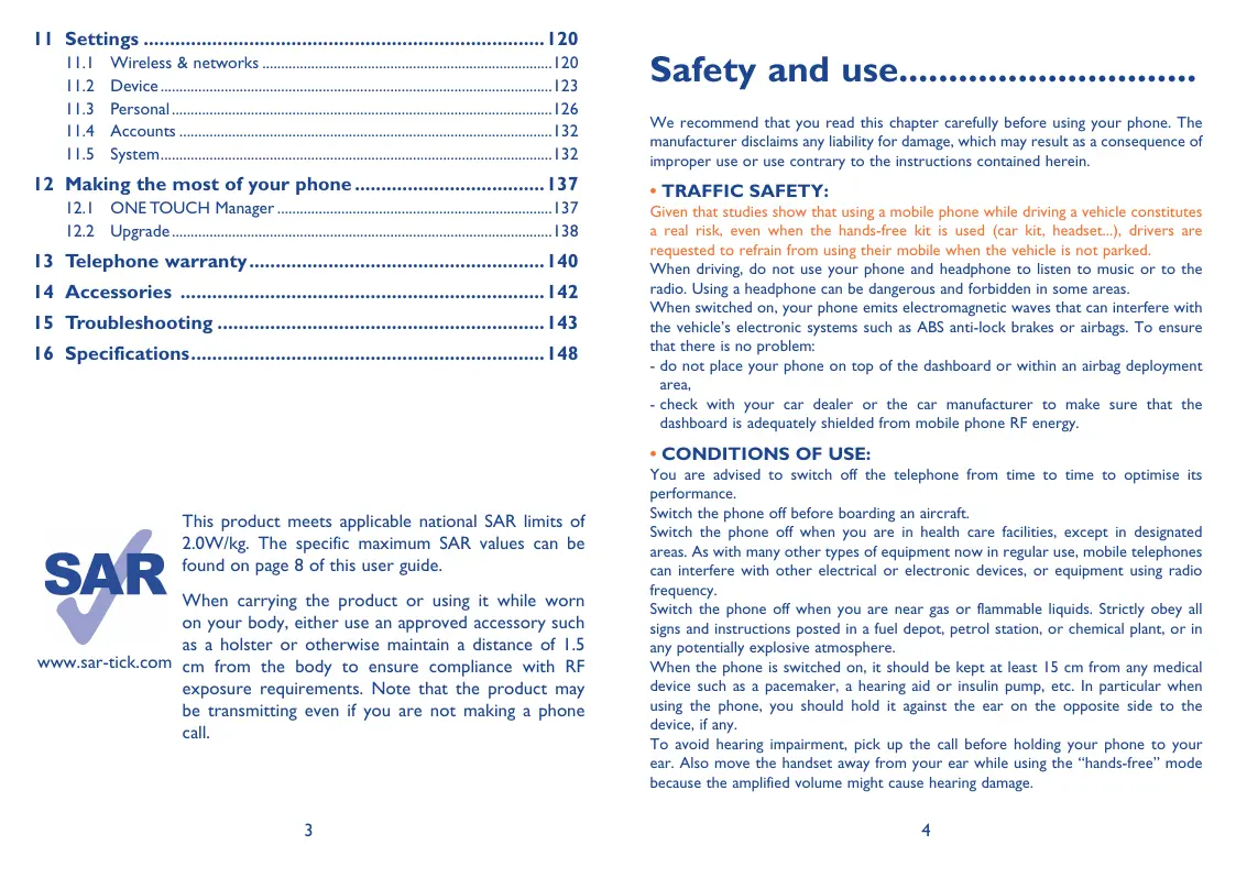 When the phone is switched on, it should be kept at least 15 cm from any medical device such as à pacemaker, a hearing aid or insulin pump, etc. In particular when using the phone, you should hold it against the ear on the opposite side to the device, if any.
