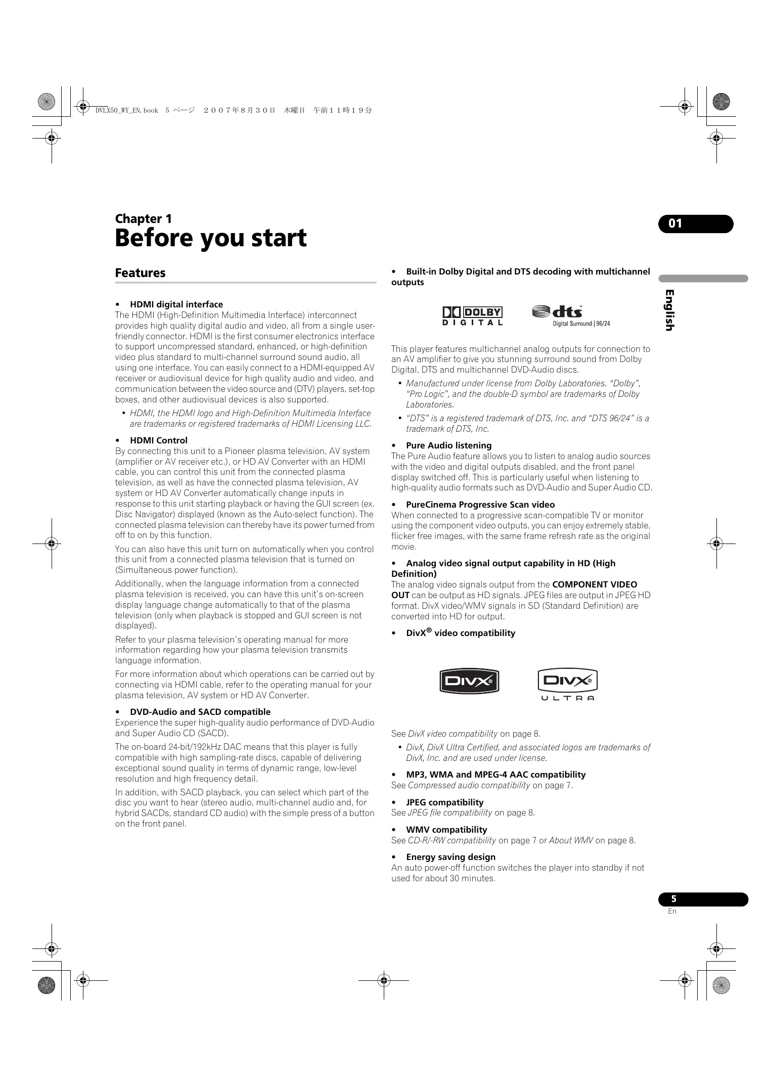 + “DTS"is a registered trademark of DTS, Inc. and “DTS 96/24" is a trademark of DTS, Inc.