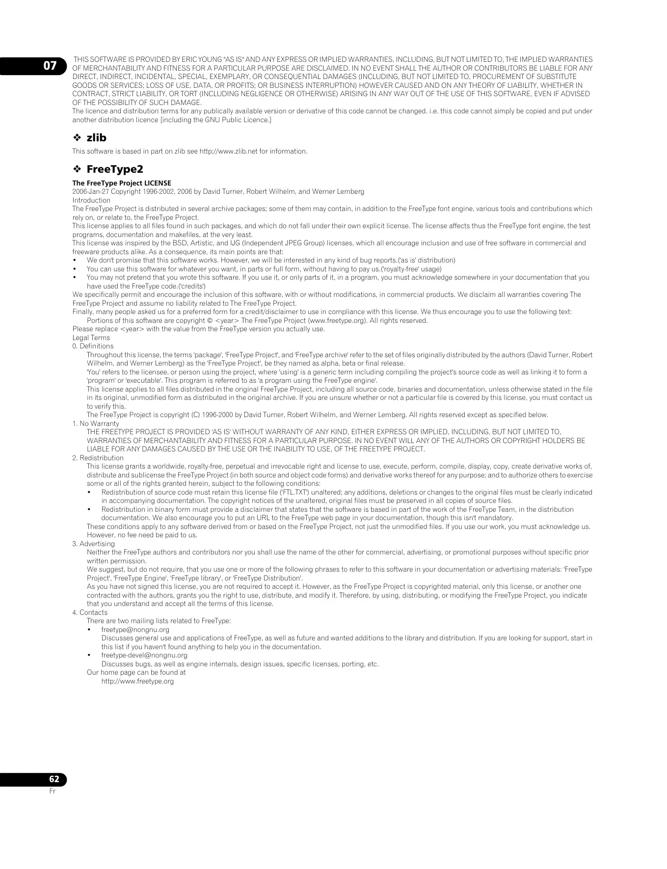 THIS SOFTWARE IS PROVIDED BY ERIC YOUNG ''AS IS'' AND ANY EXPRESS OR IMPLIED WARRANTIES, INCLUDING, BUT NOT LIMITED TO, THE IMPLIED WARRANTIES OF MERCHANTABILITY AND FITNESS FOR A PARTICULAR PURPOSE ARE DISCLAIMED. IN NO EVENT SHALL THE AUTHOR OR CONTRIBUTORS BE LIABLE FOR ANY DIRECT, INDIRECT, INCIDENTAL, SPECIAL, EXEMPLARY, OR CONSEQUENTIAL DAMAGES (INCLUDING, BUT NOT LIMITED TO, PROCUREMENT OF SUBSTITUTE GOODS OR SERVICES; LOSS OF USE, DATA, OR PROFITS; OR BUSINESS INTERRUPTION) HOWEVER CAUSED AND ON ANY THEORY OF LIABILITY, WHETHER IN CONTRACT, STRICT LIABILITY, OR TORT (INCLUDING NEGLIGENCE OR OTHERWISE) ARISING IN ANY WAY OUT OF THE USE OF THIS SOFTWARE, EVEN IF ADVISED OF THE POSSIBILITY OF SUCH DAMAGE. The licence and distribution terms for any publically available version or derivative of this code cannot be changed. i.e. this code cannot simply be copied and put under another distribution licence [including the GNU Public Licence.] zlib This software is based in part on zlib see http://www.zlib.net for information. FreeType2 The FreeType Project LICENSE 2006-Jan-27 Copyright 1996-2002, 2006 by David Turner, Robert Wilhelm, and Werner Lemberg Introduction The FreeType Project is distributed in several archive packages; some of them may contain, in addition to the FreeType font engine, various tools and contributions which rely on, or relate to, the FreeType Project. This license applies to all files found in such packages, and which do not fall under their own explicit license. The license affects thus the FreeType font engine, the test programs, documentation and makefiles, at the very least. This license was inspired by the BSD, Artistic, and IJG (Independent JPEG Group) licenses, which all encourage inclusion and use of free software in commercial and freeware products alike. As a consequence, its main points are that: