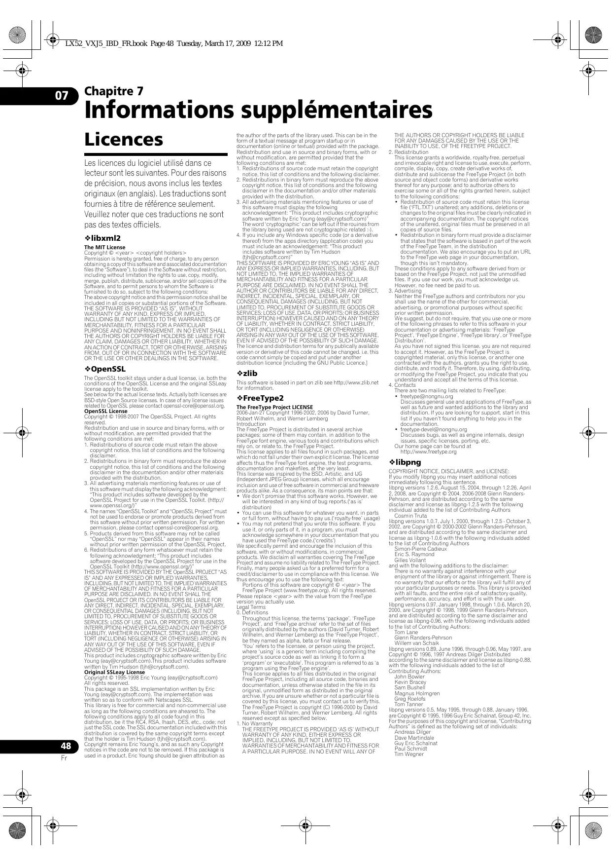 LX52_VXJ5_IBD_FR.book Page 49 Tuesday, March 17, 2009 12:12 PM The PNG Reference Library is supplied “AS IS”. The Contributing Authors and Group 42, Inc. disclaim all warranties, expressed or implied, including, without limitation, the warranties of merchantability and of fitness for any purpose. The Contributing Authors and Group 42, Inc. assume no liability for direct, indirect, incidental, special, exemplary, or consequential damages, which may result from the use of the PNG Reference Library, even if advised of the possibility of such damage. Permission is hereby granted to use, copy, modify, and distribute this source code, or portions hereof, for any purpose, without fee, subject to the following restrictions: 1. The origin of this source code must not be misrepresented. 2. Altered versions must be plainly marked as such and must not be misrepresented as being the original source. 3. This Copyright notice may not be removed or altered from any source or altered source distribution. The Contributing Authors and Group 42, Inc. specifically permit, without fee, and encourage the use of this source code as a component to supporting the PNG file format in commercial products. If you use this source code in a product, acknowledgment is not required but would be appreciated. A “png_get_copyright” function is available, for convenient use in “about” boxes and the like: printf(“%s”,png_get_copyright(NULL));Also, the PNG logo (in PNG format, of course) is supplied in the files “pngbar.png” and “pngbar.jpg (88x31) and “pngnow.png” (98x31). Libpng is OSI Certified Open Source Software. OSI Certified Open Source is a certification mark of the Open Source Initiative. Glenn Randers-Pehrson glennrp at users.sourceforge.net 2-Apr-08