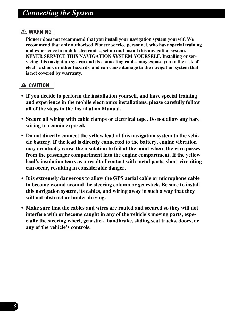 onnecting the System WARNING Pioneer does not recommend that you install your navigation system yourself. We recommend that only authorised Pioneer service personnel, who have special training and experience in mobile electronics, set up and install this navigation system. NEVER SERVICE THIS NAVIGATION SYSTEM YOURSELF. Installing or ser- vicing this navigation system and its connecting cables may expose you to the risk of electric shock or other hazards, and can cause damage to the navigation system that is not covered by warranty. À CAUTION If you decide to perform the installation yourself, and have special training and experience in the mobile electronics installations, please carefully follow all of the steps in the Installation Manual. Secure all wiring with cable clamps or electrical tape. Do not allow any bare wiring to remain exposed. Do not directly connect the yellow lead of this navigation system to the vehi- cle battery. If the lead is directly connected to the battery, engine vibration may eventually cause the insulation to fail at the point where the wire passes from the passenger compartment into the engine compartment. If the yellow lead’s insulation tears as a result of contact with metal parts, short-circuiting can occur, resulting in considerable danger. It is extremely dangerous to allow the GPS aerial cable or microphone cable to become wound around the steering column or gearstick. Be sure to install this navigation system, its cables, and wiring away in such a way that they will not obstruct or hinder driving. Make sure that the cables and wires are routed and secured so they will not interfere with or become caught in any of the vehicle’s moving parts, espe- cially the steering wheel, gearstick, handbrake, sliding seat tracks, doors, or any of the vehicle’s controls.