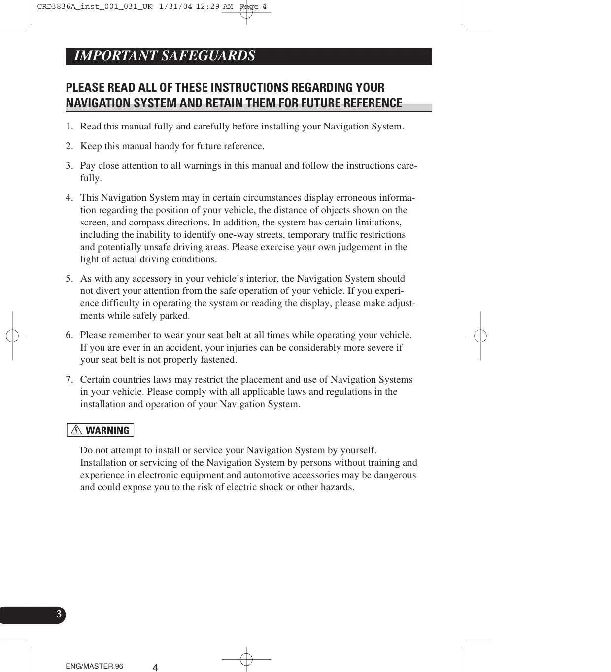 CRD3836A_inst_001 031 UK 1/31/04 12:29 AM Page 2 ABOUT YOUR NEW NAVIGATION SYSTEM AND THIS MANUAL The navigation features of this unit (and rear view camera option if purchased) is intended solely as an aid to you in the operation of your vehicle. It is not a substi- tute for your attentiveness, judgement and care when driving. Never use this Navigation System to route to hospitals, police stations, or similar facilities in an emergency, Please call the appropriate emergency number. Do not operate this Navigation System (or the rear view camera option if pur- chased) if doing so in any way will divert your attention from the safe operation of your vehicle. Traffic restrictions and advisories currently in force should always take precedence over guidance given by this product. Always obey current traffic restrictions, even if this product provides contrary advice. This manual explains how to install this Navigation System in your vehicle. Operation of this Navigation System is explained in the separate “Operation Manual” or “Hardware Manual” for Navigation System. Do not install the display unit or Hide-away unit where it may (i) obstruct the dri- ver’s vision, (ii) impair the performance of any of the vehicle’s operating systems of safety features, including airbags, hazard lamp buttons or (äii) impair the dri- ver’s ability to safely operate the vehicle. In some cases, it may not be possible to aus install this unit because of the vehicle type or the shape of the vehicle interior. ENG/MASTER 96 2