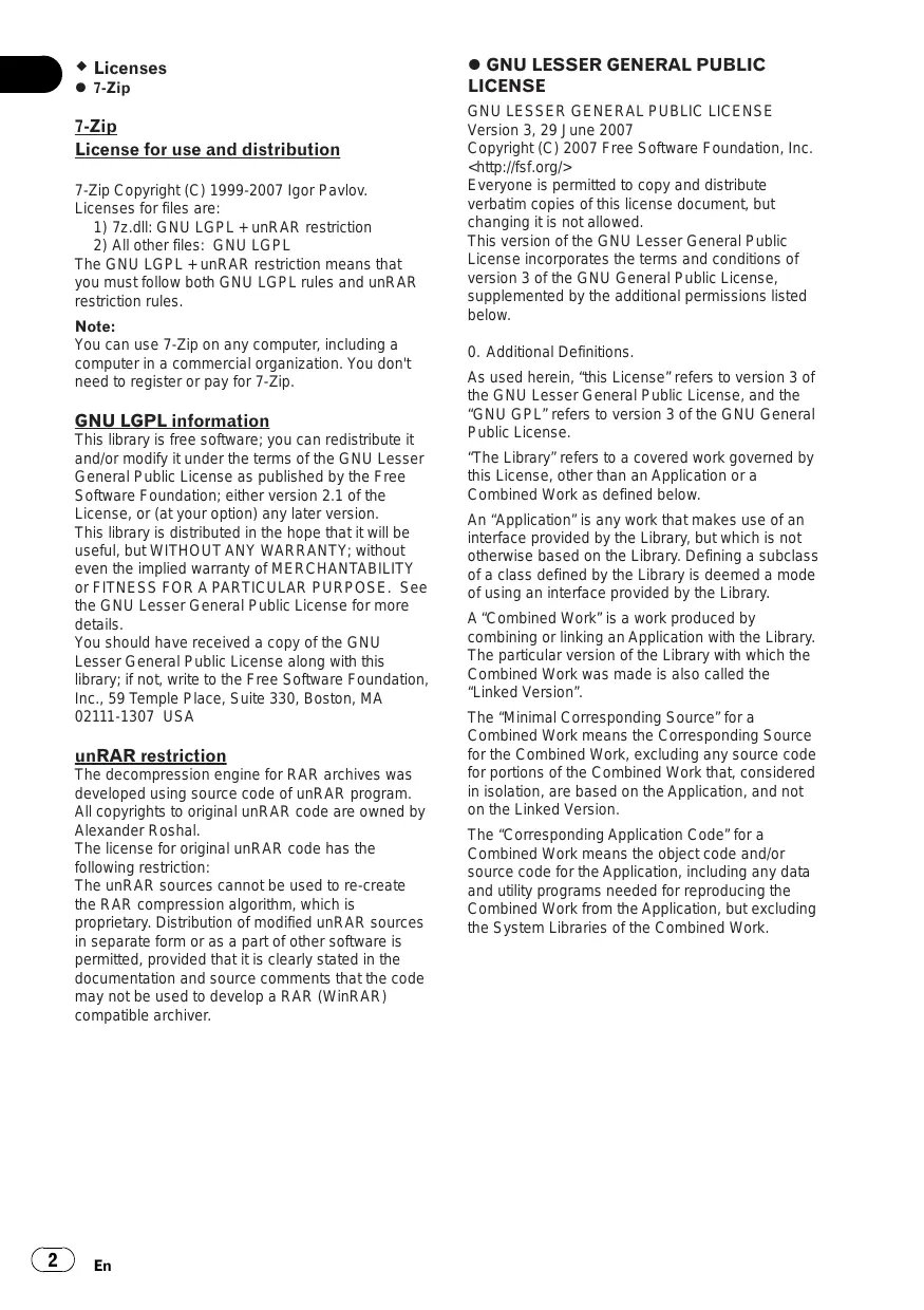 Supplied CD-ROM Operating Environment The supplied CD-ROM can be used with Microsoftâ Windowsâ 2000/XP and Apple Mac OS X 10.4. Adobe Reader (Version 4.0 or later) is required to read the CD-ROM. Precautions For Use The CD-ROM is for use with a personal computer. It cannot be used with any other DVD/ CD players or drives. Attempting to run the CD-ROM with such equipment can damage speakers or cause impaired hearing due to excessively loud volume. License Please agree to Terms of Use indicated below before using the CD-ROM. Do not use if you are unwilling to consent to the terms of its use. Terms of Use Copyright to data provided on the CD-ROM belongs to Pioneer Corporation. Unauthorized transfer, duplication, broadcast, public transmission, translation, sales, lending or other such matters that go beyond the scope of “personal use” or “citation” as defined by Copyright Law may be subject to punitive actions. Permission to use the CD-ROM is granted under license by Pioneer Corporation.