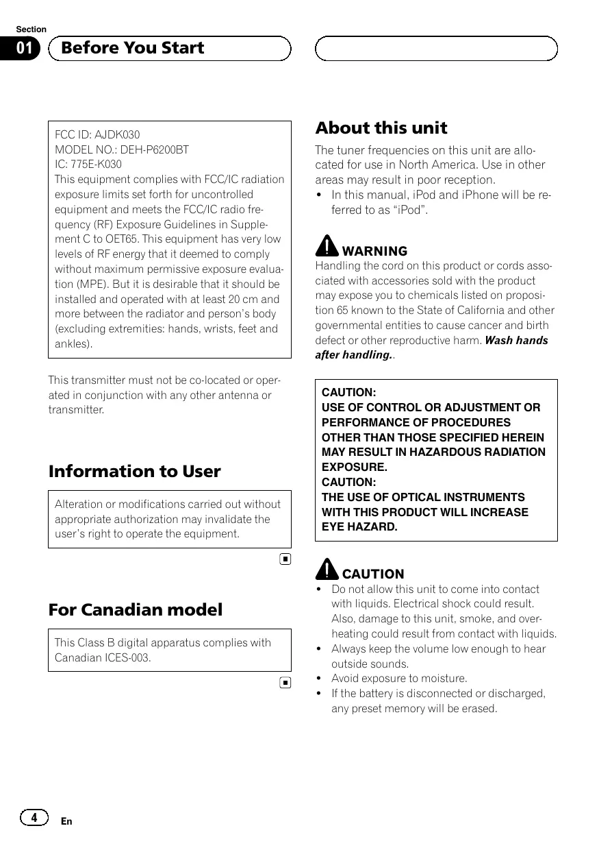 IC: 775E-K030 This equipment complies with FCC/IC radiation exposure limits set forth for uncontrolled equipment and meets the FCC/IC radio frequency (RF) Exposure Guidelines in Supplement C to OET65. This equipment has very low levels of RF energy that it deemed to comply without maximum permissive exposure evaluation (MPE). But it is desirable that it should be installed and operated with at least 20 cm and more between the radiator and person’s body (excluding extremities: hands, wrists, feet and ankles). This transmitter must not be co-located or operated in conjunction with any other antenna or transmitter. Information to User Alteration or modifications carried out without appropriate authorization may invalidate the user’s right to operate the equipment. About this unit The tuner frequencies on this unit are allocated for use in North America. Use in other areas may result in poor reception. ! In this manual, iPod and iPhone will be referred to as “iPod”. WARNING Handling the cord on this product or cords associated with accessories sold with the product may expose you to chemicals listed on proposition 65 known to the State of California and other governmental entities to cause cancer and birth defect or other reproductive harm. Wash hands after handling.. CAUTION: