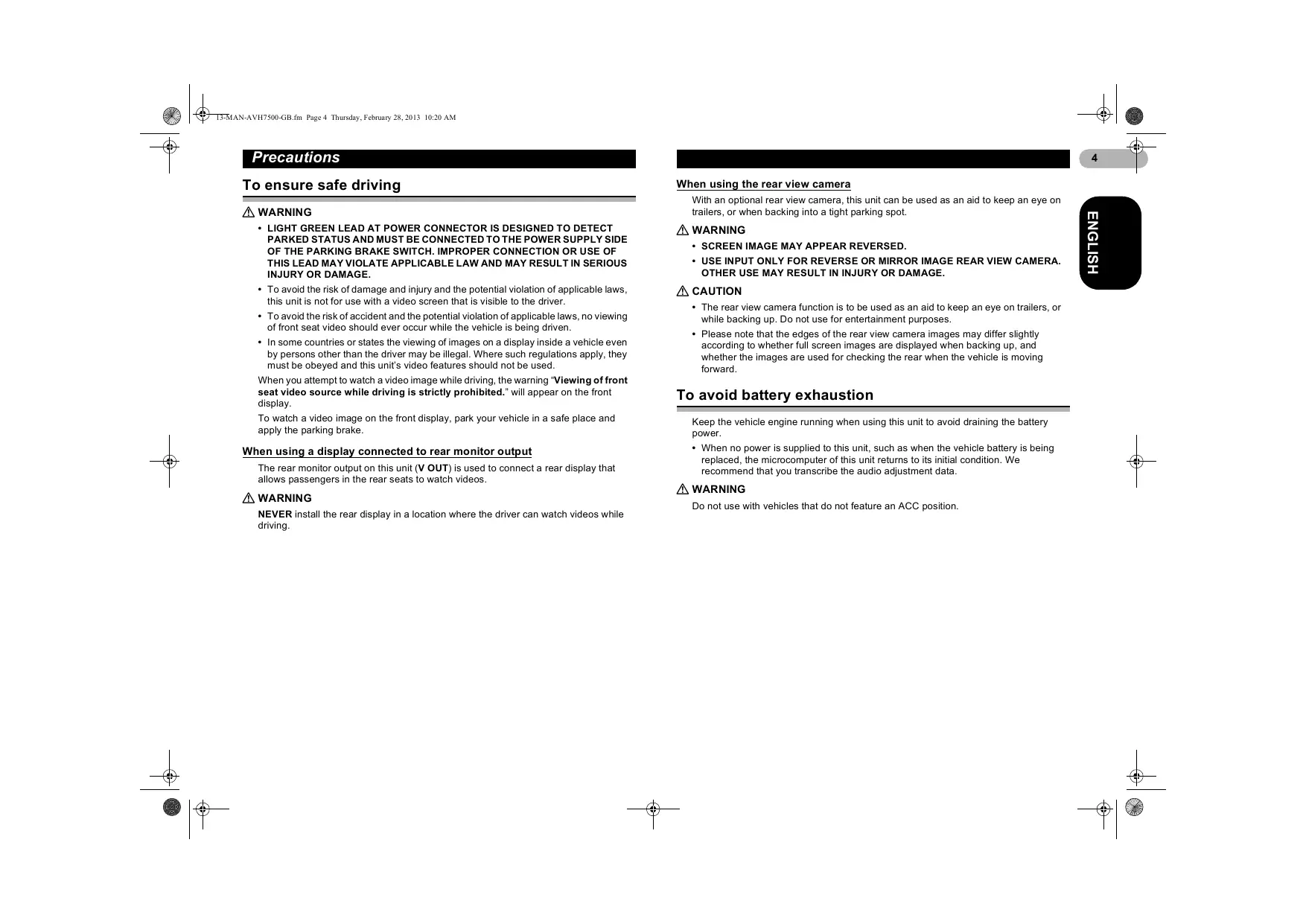 AN-AVH17500-GB.in Page 4 Thursday, February 2,201 10:20 AM Precautions To ensure safe driving À WARNING + LIGHT GREEN LEAD AT POWER CONNECTOR IS DESIGNED TO DETECT PARKED STATUS AND MUST BE CONNECTED TO THE POWER SUPPLY SIDE OF THE PARKING BRAKE SWITCH. IMPROPER CONNECTION OR USE OF THIS LEAD MAY VIOLATE APPLICABLE LAW AND MAY RESULT IN SERIOUS INJURY OR DAMAGE. + To avoid the risk of damage and injury and the potential violation of applicable laws. this unit is not for use with a video screen that is visible to the driver. + To avoid the risk of accident and the potential violation of applicable laws, no viewing of front seat video should ever occur while the vehicle is being driven + In some countries or states the viewing of images on a display inside a vehicle even by persons other than the driver may be illegal. Where such regulations apply, they must be obeyed and this unifs video features should not be used When you attemptto watch a video image while driving, the warning “Viewing of front seat video source while driving is strictiy prohibited." will appear on the front display. To waïch a video image on the front display, park your vehicle in a safe place and apply the parking brake When using a display connected to rear monitor output The rear monitor output on this unit (V OUT) is used to connect a rear display that allows passengers in the rear seats to watch videos À WARNING NEVER install the rear display in a location where the driver can watch videos while driving, When using the rear view camera With an optional rear view camera, this unit can be used as an aid to keep an eye on trailers, or when backing into a tight parking spot À WARNING + SCREEN IMAGE MAY APPEAR REVERSED. + USE INPUT ONLY FOR REVERSE OR MIRROR IMAGE REAR VIEW CAMERA. OTHER USE MAY RESULT IN INJURY OR DAMAGE. À CAUTION + The rear view camera function is to be used as an aid to keep an eye on trallers, or while backing up. Do not use for entertainment purposes, + Please note that the edges of he rear view camera images may differ slightiy according to whether full screen images are displayed when backing up, and whether the images are used for checking the rear when the vehicle is moving forward To avoid battery exhaustion Keep the vehicle engine running when using this unit to avoid draining the battery power. + When no power is supplied to this unit, such as when the vehicle battery is being replaced, the microcomputer of this unit retums to its initial condition. We recommend that you transcribe the audio adjustment data. À WARNING Do not use with vehicles that do not feature an ACC position [ul]
