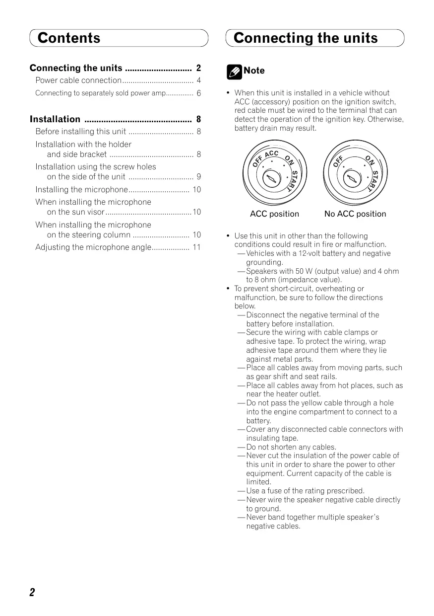 - Use this unit in other than the following conditions could result in fire or malfunction. — Vehicles with a 12-volt battery and negative grounding. — Speakers with 50 W (output value) and 4 ohm to 8 ohm (impedance value).