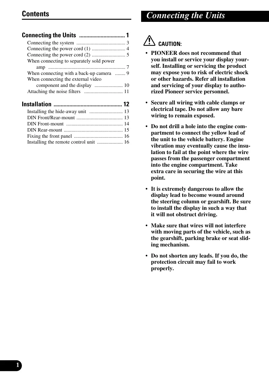 - PIONEER does not recommend that you install or service your display yourself. Installing or servicing the product may expose you to risk of electric shock or other hazards. Refer all installation and servicing of your display to authorized Pioneer service personnel.