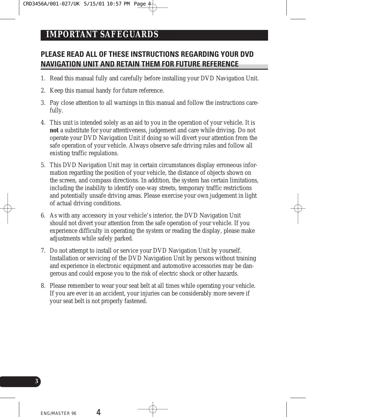 | ENG/MASTER 96 4 + Read this manual fully and carefully before installing your DVD Navigation Unit. Keep this manual handy for future reference. Pay close attention to all warnings in this manual and follow the instructions care- fully. . This unit is intended solely as an aid to you in the operation of your vehicle. Itis not a substitute for your attentiveness, judgement and care while driving. Do not operate your DVD Navigation Unit if doing so will divert your attention from the safe operation of your vehicle. Always observe safe driving rules and follow all existing traffic regulations. . This DVD Navigation Unit may in certain circumstances display erroneous infor- mation regarding the position of your vehicle, the distance of objects shown on the screen, and compass directions. In addition, the system has certain limitations, including the inability to identify one-way streets, temporary traffic restrictions and potentially unsafe driving areas. Please exercise your own judgement in light of actual driving conditions. . As with any accessory in your vehicle’s interior, the DVD Navigation Unit should not divert your attention from the safe operation of your vehicle. If you experience difficulty in operating the system or reading the display, please make adjustments while safely parked. . Do not attempt to install or service your DVD Navigation Unit by yourself. Installation or servicing of the DVD Navigation Unit by persons without training and experience in electronic equipment and automotive accessories may be dan- gerous and could expose you to the risk of electric shock or other hazards. … Please remember to wear your seat belt at all times while operating your vehicle. If you are ever in an accident, your injuries can be considerably more severe if your seat belt is not properly fastened.