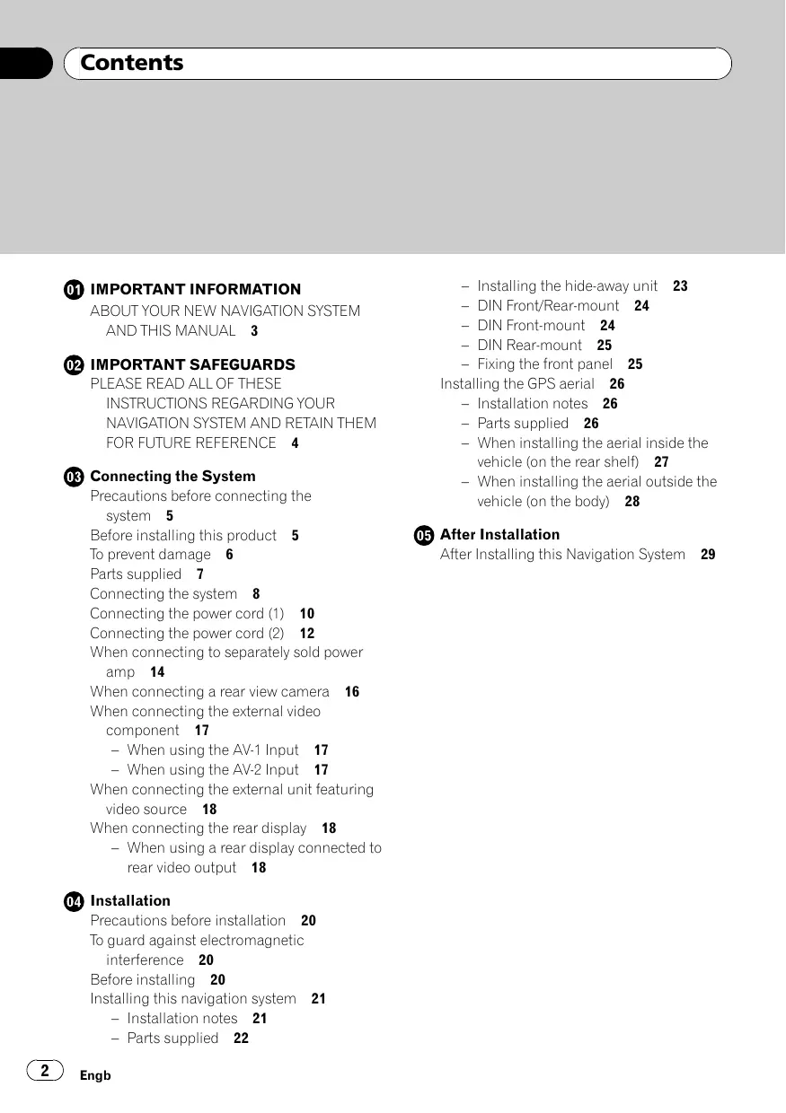 @® Connecting the System Précautions before connecting the system 5 Before installing this product 5 To prevent damage 6 Parts supplied 7 Connecting the system 8 Connecting the power cord (1) 10 Connecting the power cord (2) 12 When connecting to separately sold power amp 14 When connecting a rear view camera 16 When connecting the external video component 17 — When using the AV: Input 17 — When using the AV2 Input 17 When connecting the external unit featuring video source 18 When connecting the rear display 18 — When using à rear display connected to rear video output 18