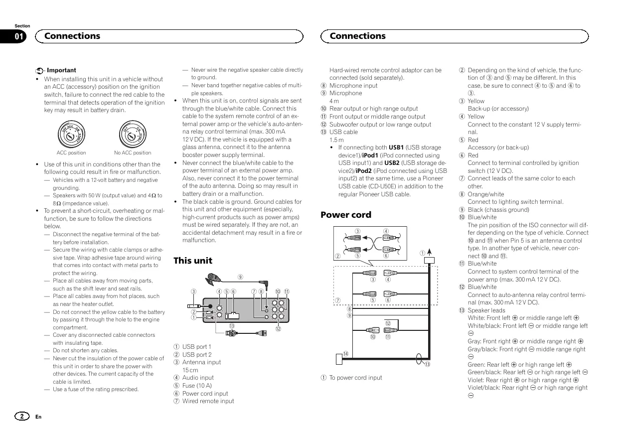 <&- Important When instaling this unit in a vehicle without an ACC (accessonj) position on the ignition smitch, fallure to connect the red cable to the terminal that detects operation of the ignition Key may result in battery drain ACC position No AC position Use of this unit in conditions other than the following could result in fire or malfunction. — Vehicles with à 12401 battery and negative grounding. — Speakers with SDW (output value) and 40 to 80 (mpedance value). TT prevent a short-cireuit, overheating or mal function, be sure to follow the directions below. — Disconnect the negative terminal of the bat tery before installation. — Secure the wiring with cable clamps or adhe: sive tape. Wrap adhesive tape around wiring hat comes into contact with metal parts to protect the wiring — Place all cables away from moving parts, such as the shift lever and seat ral. — Place all cables away from hot places, such as near the heater out — Do not connect the yellow cable t the battery by passing it through the hole to the engine compartment — Cover any disconnected cable connectors with insulating tape. — Do not shorten any cables. — Never cut the insulation of he power cable of this uni in order to share the power with other devices, The current capacity ofthe cable is limited — Use a fuse of the rating prescribed. — Never vire he negative speaker cable directly to ground. — Never band together negative cables of multi ple speakers. + When this unit is on, control signals are sent through the blue/white cable. Connect this. cable to the system remate control of an ex: termal power amp or the vehicle’ auto-anten- na relay control terminal (max. 800 mA 12VD0). If the vehicle is equipped with a glass antenna, connect ita the antenna booster pouer supply terminal. + Never connect he blue/white cable to the power terminal of an external power amp. Also, never connect it to the power terminal ofthe auto antenna. Doing so may result in battery drain or a malfunction: The black cable is ground. Ground cables for this unit and other equipment (especially high-current products such as power amps) must be wired separately. they are not, an accidental detachment may result in a fire or malfunction. This unit USB por 1 @ USB por 2 @ Antenna input 15cm @ Audio input © Fuse (10 A) © Power cord input Wired remote input Hardwired remote control adaptor can be connected (sold separatel. @ Microphone input © Microphone % Rear output or high range output D. Front output or middle range output 4 Subwoofer output or low range output 4 USB cable 15m + lfconnecting both USB1 (USB storage devicel)APodi (iPod connected using USB inputt) and USB2 (USB storage de- vice2Pod2 (IPod connected using USB input2) at the same time, use a Pioneer USB cable (CD-USOE) in addition to the reguiar Pioneer USB cable. Power cord