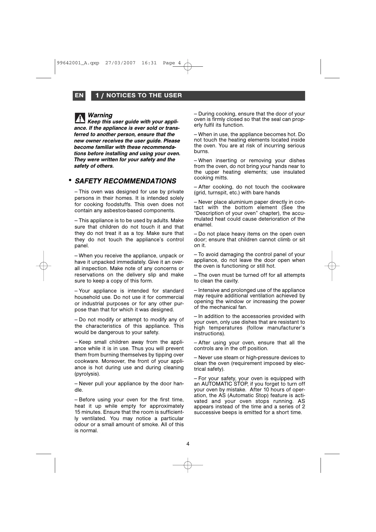 - SAFETY RECOMMENDATIONS — After cooking, do not touch the cookware (grid, turnspit, etc.) with bare hands — This oven was designed for use by private persons in their homes. It is intended solely for cooking foodstuffs. This oven does not contain any asbestos-based components. — Never place aluminium paper directly in contact with the bottom element (See the “Description of your oven” chapter), the accumulated heat could cause deterioration of the enamel. — This appliance is to be used by adults. Make sure that children do not touch it and that they do not treat it as a toy. Make sure that they do not touch the appliance’s control panel. — Do not place heavy items on the open oven door; ensure that children cannot climb or sit on it. — When you receive the appliance, unpack or have it unpacked immediately. Give it an overall inspection. Make note of any concerns or reservations on the delivery slip and make sure to keep a copy of this form. — To avoid damaging the control panel of your appliance, do not leave the door open when the oven is functioning or still hot. — Your appliance is intended for standard household use. Do not use it for commercial or industrial purposes or for any other purpose than that for which it was designed. — Intensive and prolonged use of the appliance may require additional ventilation achieved by opening the window or increasing the power of the mechanical fan. — Do not modify or attempt to modify any of the characteristics of this appliance. This would be dangerous to your safety. — In addition to the accessories provided with your oven, only use dishes that are resistant to high temperatures (follow manufacturer’s instructions). — The oven must be turned off for all attempts to clean the cavity. — Keep small children away from the appliance while it is in use. Thus you will prevent them from burning themselves by tipping over cookware. Moreover, the front of your appliance is hot during use and during cleaning (pyrolysis). — After using your oven, ensure that all the controls are in the off position. — Never use steam or high-pressure devices to clean the oven (requirement imposed by electrical safety). — For your safety, your oven is equipped with an AUTOMATIC STOP, if you forget to turn off your oven by mistake. After 10 hours of operation, the AS (Automatic Stop) feature is activated and your oven stops running. AS appears instead of the time and a series of 2 successive beeps is emitted for a short time. — Never pull your appliance by the door handle. — Before using your oven for the first time, heat it up while empty for approximately 15 minutes. Ensure that the room is sufficiently ventilated. You may notice a particular odour or a small amount of smoke. All of this is normal.