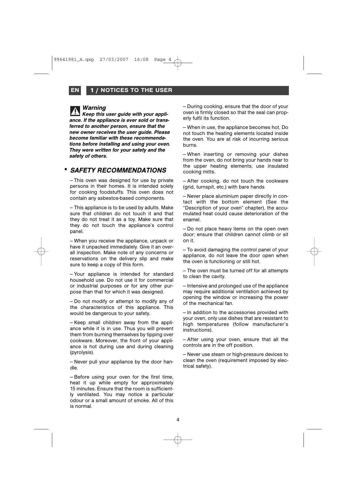 - SAFETY RECOMMENDATIONS — This oven was designed for use by private persons in their homes. It is intended solely for cooking foodstuffs. This oven does not contain any asbestos-based components. — After cooking, do not touch the cookware (grid, turnspit, etc.) with bare hands — Never place aluminium paper directly in contact with the bottom element (See the “Description of your oven” chapter), the accumulated heat could cause deterioration of the enamel. — This appliance is to be used by adults. Make sure that children do not touch it and that they do not treat it as a toy. Make sure that they do not touch the appliance’s control panel. — Do not place heavy items on the open oven door; ensure that children cannot climb or sit on it. — When you receive the appliance, unpack or have it unpacked immediately. Give it an overall inspection. Make note of any concerns or reservations on the delivery slip and make sure to keep a copy of this form. — To avoid damaging the control panel of your appliance, do not leave the door open when the oven is functioning or still hot. — The oven must be turned off for all attempts to clean the cavity. — Your appliance is intended for standard household use. Do not use it for commercial or industrial purposes or for any other purpose than that for which it was designed. — Intensive and prolonged use of the appliance may require additional ventilation achieved by opening the window or increasing the power of the mechanical fan. — Do not modify or attempt to modify any of the characteristics of this appliance. This would be dangerous to your safety. — In addition to the accessories provided with your oven, only use dishes that are resistant to high temperatures (follow manufacturer’s instructions). — Keep small children away from the appliance while it is in use. Thus you will prevent them from burning themselves by tipping over cookware. Moreover, the front of your appliance is hot during use and during cleaning (pyrolysis). — After using your oven, ensure that all the controls are in the off position. — Never use steam or high-pressure devices to clean the oven (requirement imposed by electrical safety). — Never pull your appliance by the door handle. — Before using your oven for the first time, heat it up while empty for approximately 15 minutes. Ensure that the room is sufficiently ventilated. You may notice a particular odour or a small amount of smoke. All of this is normal.